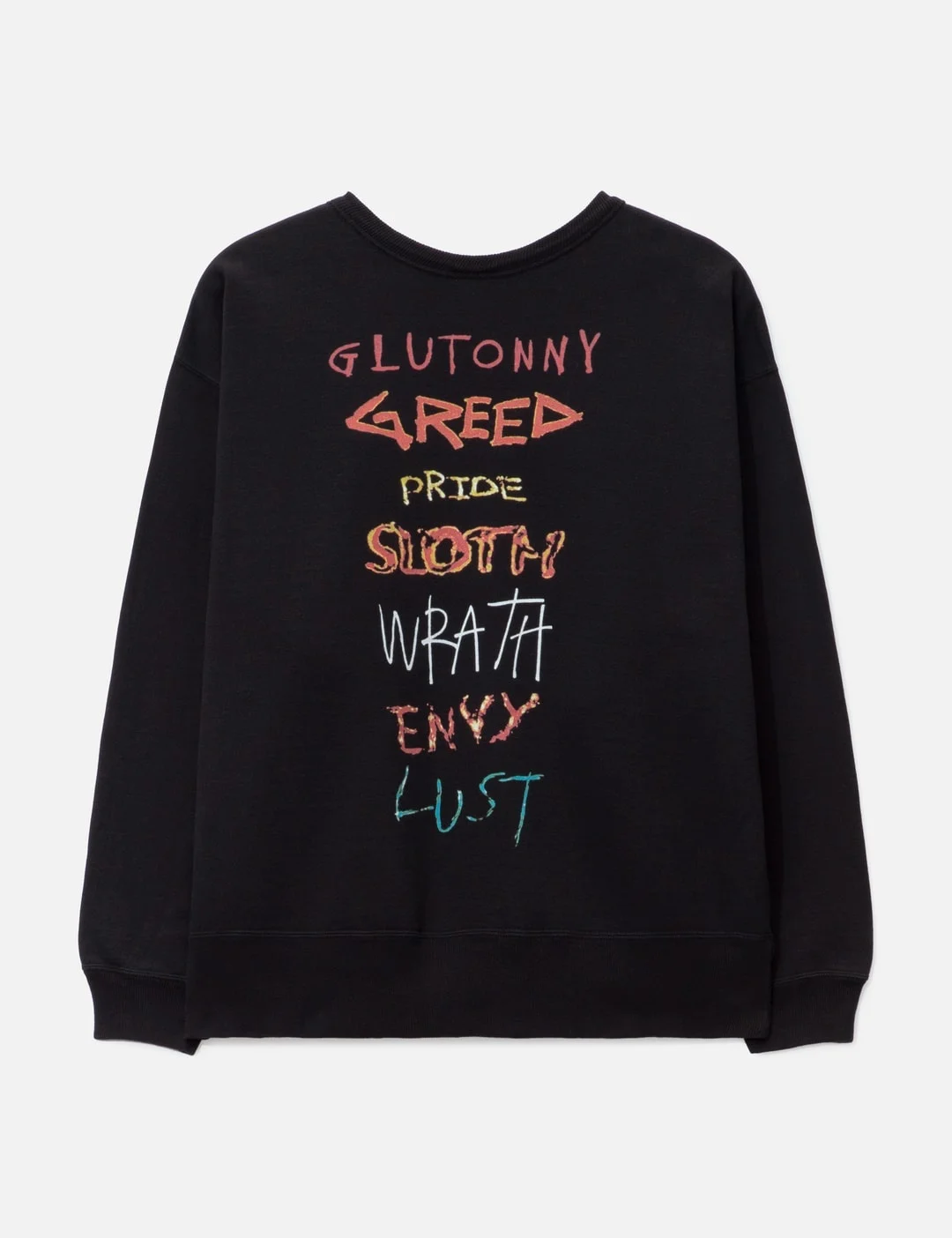 - Saint Michael - 7 Deadly Crewneck Sweatshirt - Logo print at front - Graphic print at rear - Ribbed crewneck, cuffs, and hem - Color: Black - Material: Cotton - See more Sweatshirts and Clothing SIZING - Model wears size L - Model measures: Height 186cm, Chest 34”/86cm, Waist 28”/71cm, Hip 36”/91cm