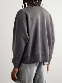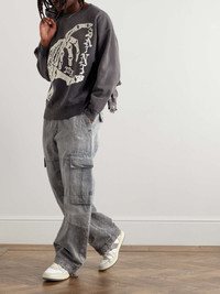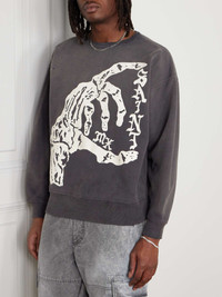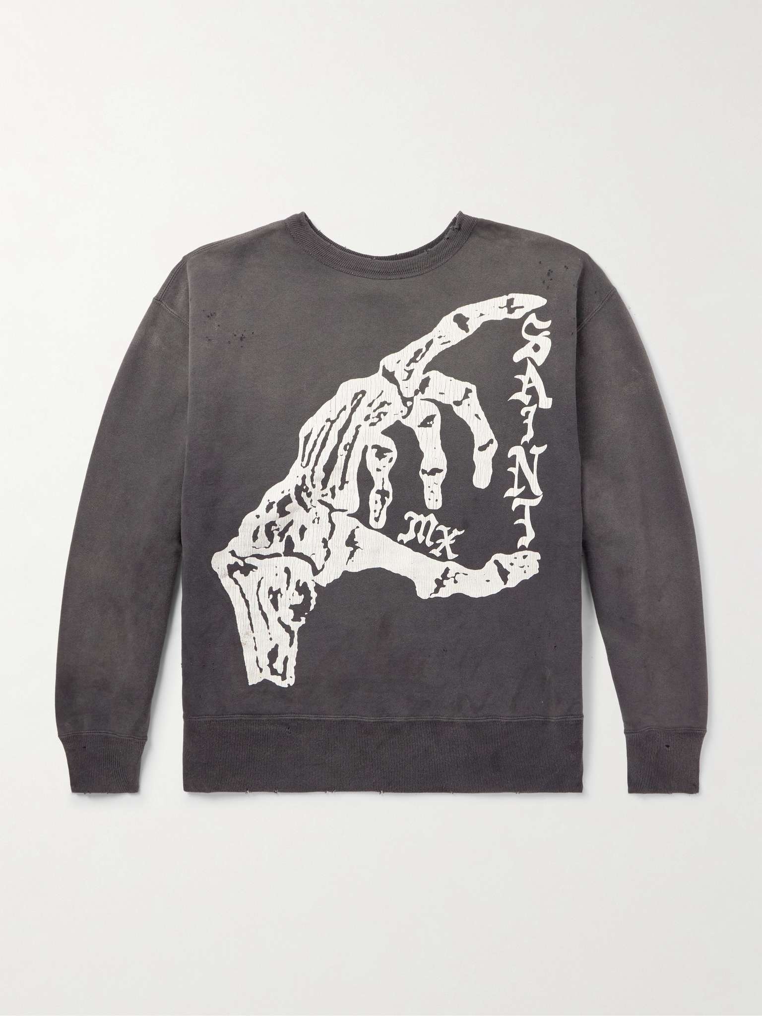 SAINT Mxxxxxx's sweatshirt is printed with a supersized skeleton hand with the label's name pinched between two fingers. It's cut from cotton-jersey that's washed and distressed for a vintage feel. Size & Fit - Fits true to size, however those who are between sizes should take the larger size - Dropped shoulder seam - Mid-weight, slightly stretchy fabric - Model is shown wearing a L - Model measures: chest 38"/ 96cm, height 6'0"/ 183cm Details & Care - Charcoal and white cotton-jersey - 100% cotton - Hand wash