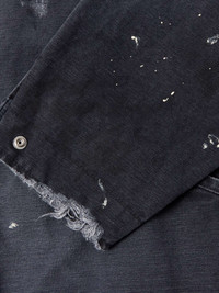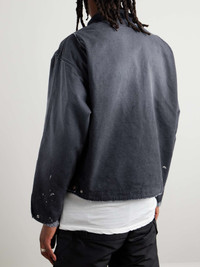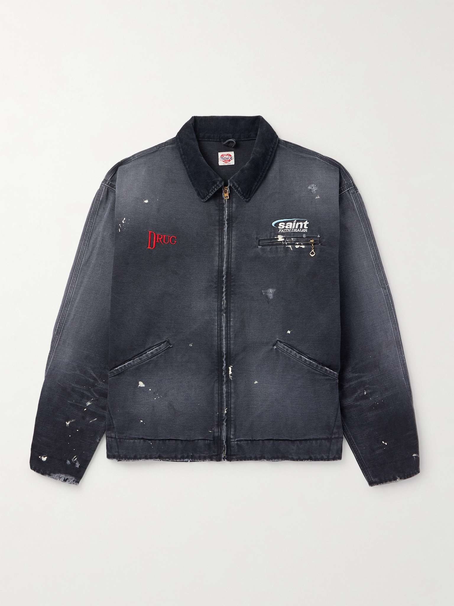 Vintage is the essence of SAINT Mxxxxxx – the brand goes to great lengths to make its pieces look and feel like the real thing. This workwear-inspired jacket is cut from heavyweight cotton-canvas that's entirely distressed by hand, from the paint splatters to the frayed edges. Note the subversive embroidery at the chest. Small to size. See Size & Fit notes. Size & Fit - Fits small to size. Take one size larger than normal - Designed for a relaxed fit - Dropped shoulder seam - Mid-weight, non-stretchy fabric - Model is shown wearing a L - Model measures: chest 38"/ 96cm, height 6'0"/ 183cm Details & Care - Black cotton-canvas and corduroy - Zip fastening - 100% cotton - Hand wash