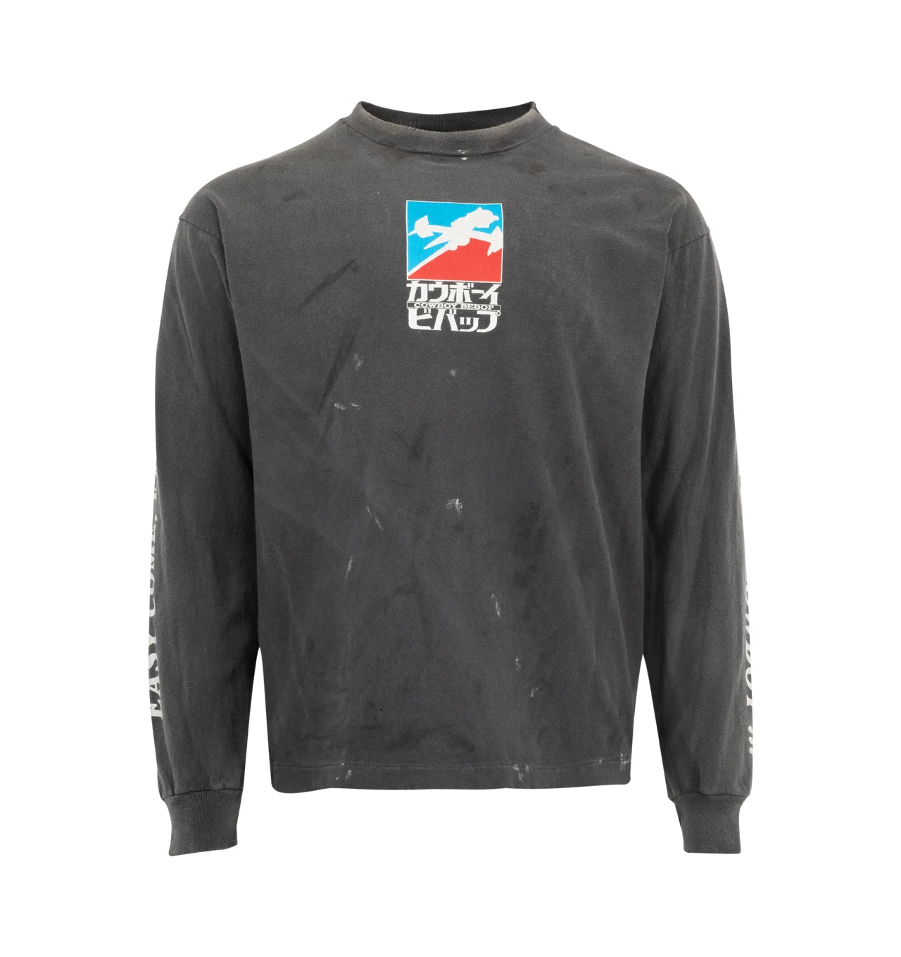 SAINT MICHAEL Easy Come Tee featuring long lseeves, crew neck, graphic print on front back and sleeves and distressing throughout. 100% cotton. DESIGNER STYLE ID: SM-HR8-0000-C06 COLOR: BLACK