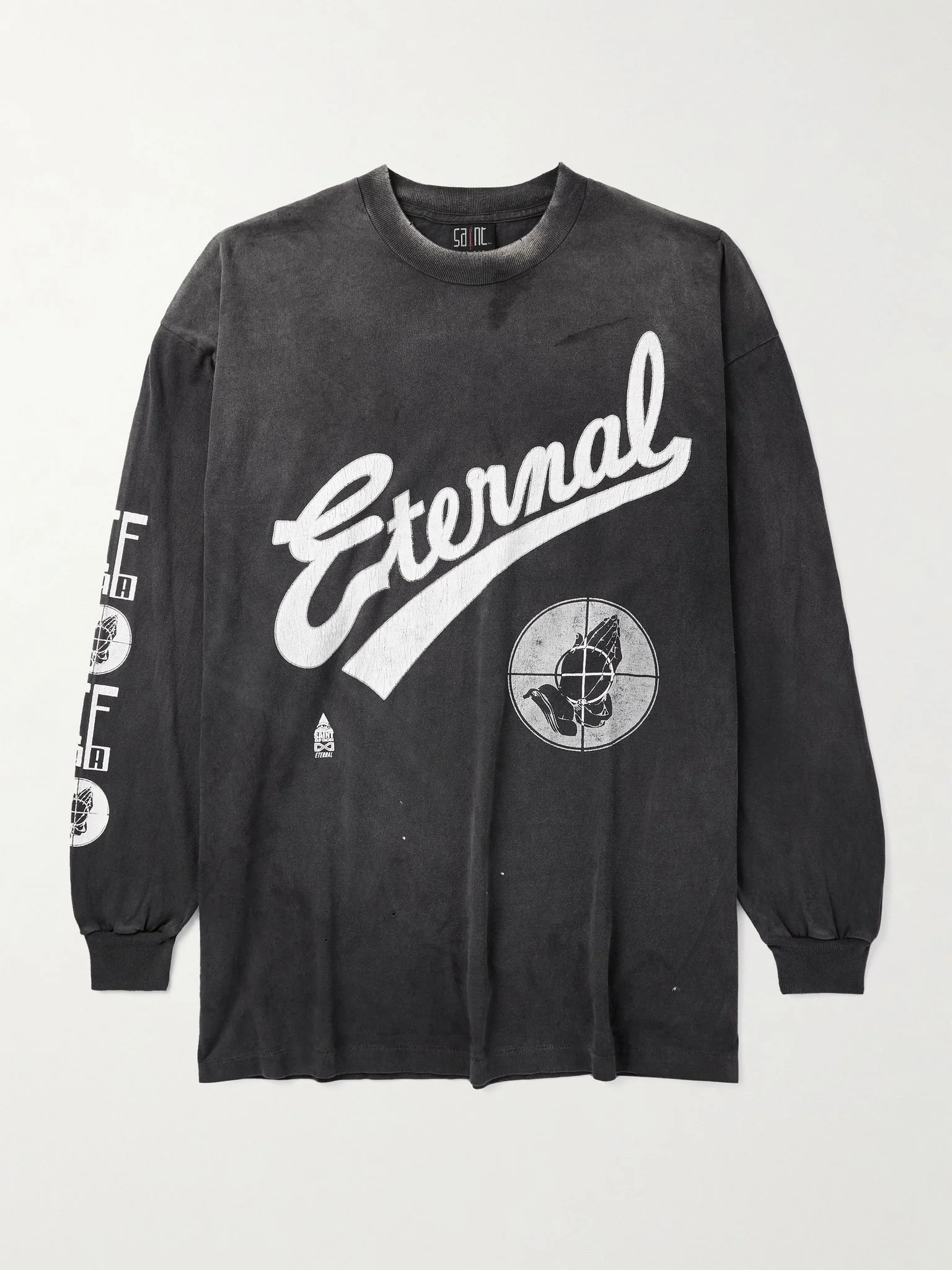 SAINT Mxxxxxx has joined forces with fellow streetwear label Fear of God on a line of staples inspired by vintage pieces. This oversized T-shirt has been made in Japan from cotton-jersey that's hand-distressed and washed for a lived-in feel and is printed with varsity-inspired graphics and the brand's logo. Size & Fit - One size, comfortably fits those who are between a size XSmall-XLarge - Mid-weight, stretchy fabric - Model measures: chest 38"/ 96cm, height 6'0"/ 183cm Details & Care - Black cotton-jersey - 100% cotton - Dry clean