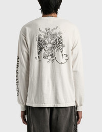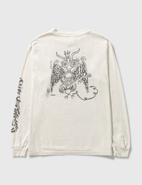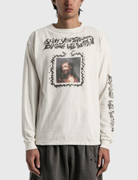 - Saint Michael - Satan T-Shirt - Long sleeves - Extra heavyweight cotton - Ribbed crewneck and cuffs - Printed graphics on front and rear - Printed text on front and left sleeve - Straight hem - Color: White - Material: 100% Cotton - See more LS T-Shirts, T-Shirts and Clothing SIZING - Model wears size M - Model measures: Height 189cm, Chest 35”/89cm, Waist 29”/74cm, Hip 37”/94cm