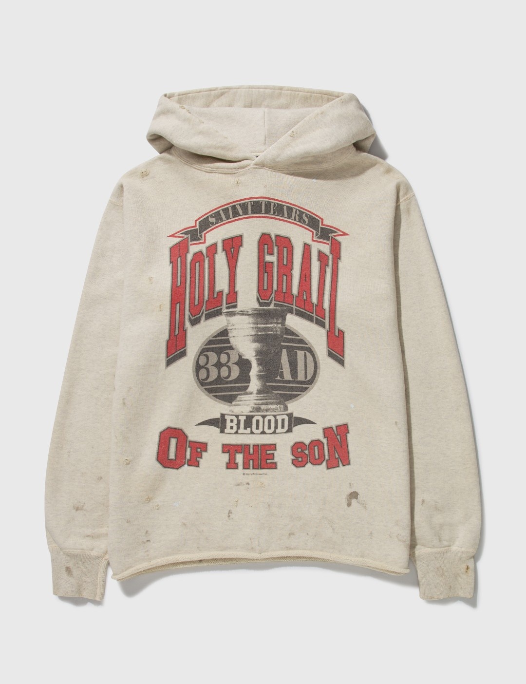 - Saint Michael - Holy Grail Hoodie - Vintage finished cotton exterior - Hooded - Graphic print at front and rear - Ribbed cuffs - Color: Grey - Material: Cotton - See more Hoodies and Clothing SIZING - Model wears size L - Model measures: Height 190cm, Bust 34"/84cm, Waist 28"/70cm, Hips 35"/90cm