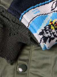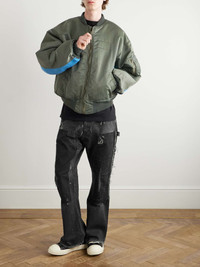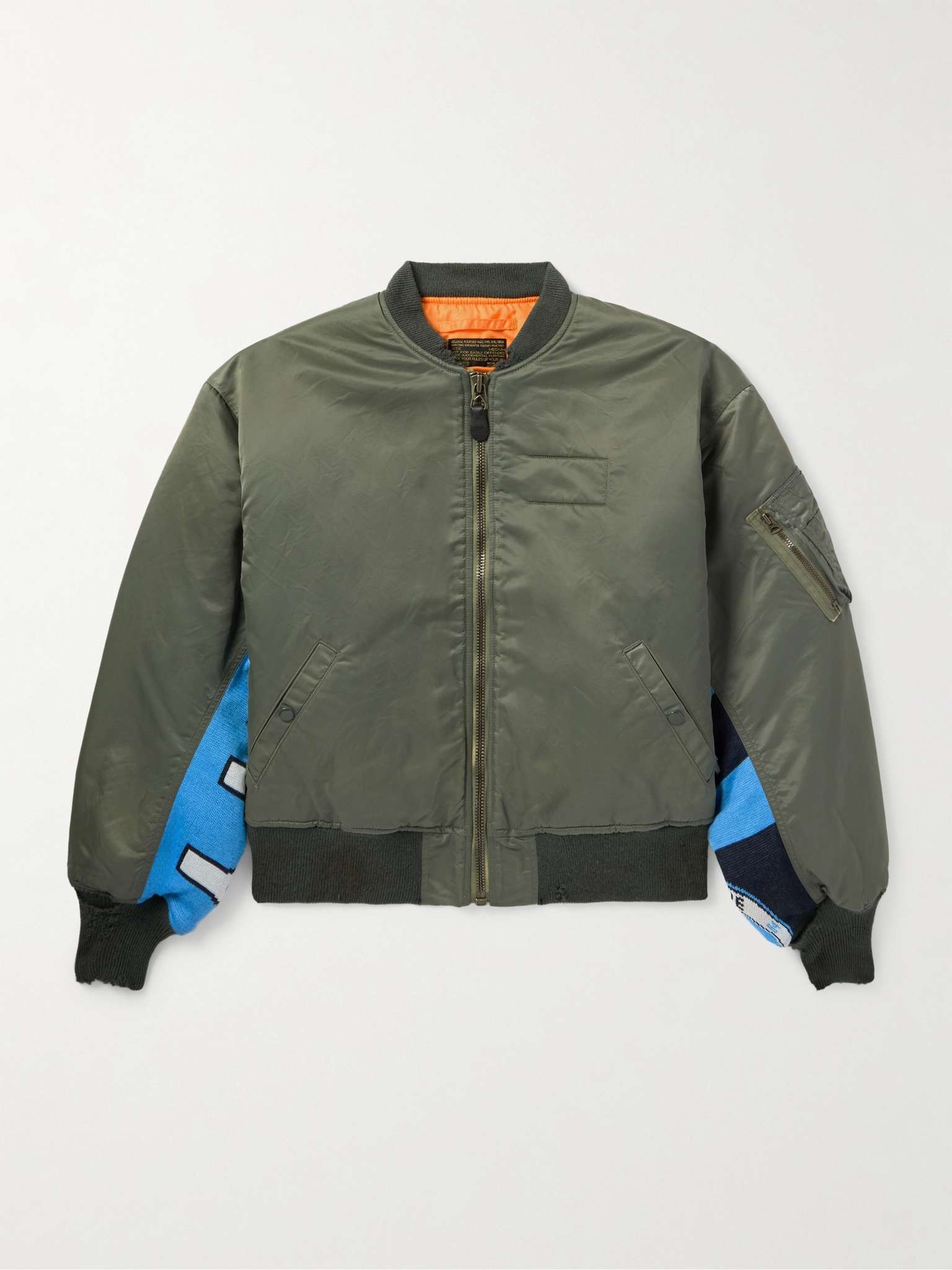 Saint Mxxxxxx, led by Cali Thornhill Dewitt and Yuta Hosokawa, is renowned for its expressive collections that highlight artistic craftsmanship. This nylon bomber jacket has been made in Japan with distressed detailing and jacquard-knit panels along the sleeves. Size & Fit - Fits true to size. Take your normal size - Designed for a loose fit - Ribbed hem - Mid-weight, non-stretchy fabric - Model is shown wearing a M - Model measures: chest 38"/ 96cm, height 6'2"/ 188cm Details & Care - Army-green nylon, multicoloured jacquard-knit - Zip fastening - Fabric1: 100% nylon; fabric2: 70% polyester, 30% acrylic; padding: 70% wool, 10% polyester, 10% nylon, 5% rayon, 5% acrylic; lining: 100% polyester - Dry clean