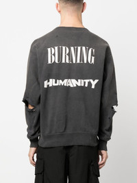 slogan-print distressed-finish sweatshirt black cotton distressed finish ripped detailing slogan print to the front slogan print to the rear graphic print to the front graphic-print sleeves crew neck long sleeves straight hem Imported Composition Cotton 100% SIZE & FIT Model measurements Height 6 ft 1 in(1.86 m) Bust/Chest 36.61 in(93 cm) Hips 37 in(94 cm) Waist 28.74 in(73 cm) Washing instructions Hand Wash