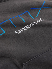 SAINT Mxxxxxx’s hoodie is printed with logos that riff on classic video games. It's cut for a relaxed fit from cotton-jersey and distressed to look like you've worn it for years. Small to size. See Size & Fit notes. Size & Fit - Fits small to size. Take one size larger than normal - Designed for a relaxed cut - Dropped shoulder seam - Mid-weight, slightly stretchy fabric - Model is shown wearing a L - Model measures: chest 38"/ 96cm, height 6'0"/ 183cm Details & Care - Black, tonal-blue and white cotton-jersey - 100% cotton - Hand wash