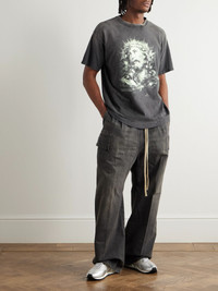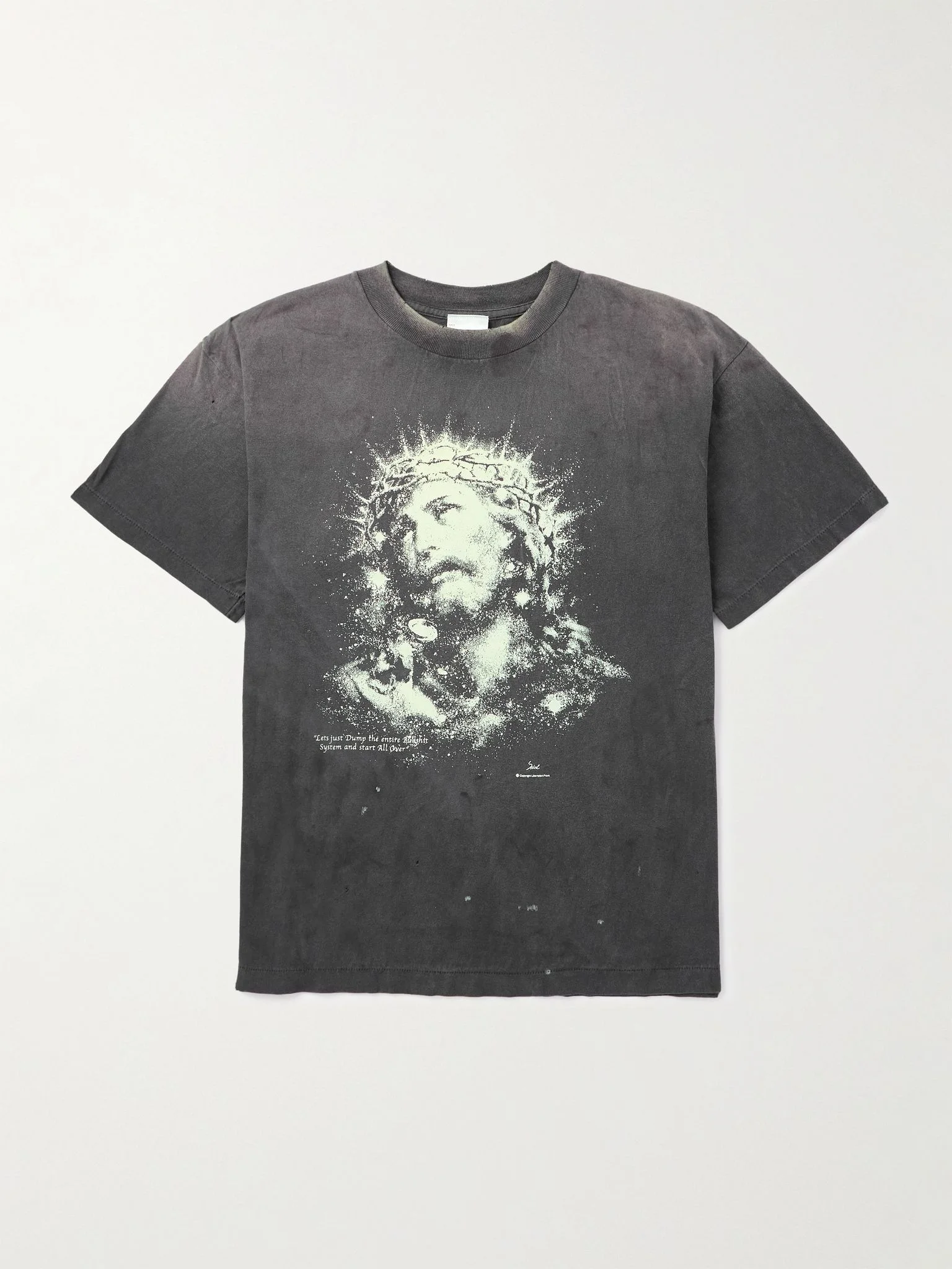 Switch off the lights and you may be surprised to see a glow-in-the-dark Jesus on SAINT Mxxxxxx's T-shirt. In the daytime, it reverts to a monochromatic design, which goes with pretty much any pair of trousers, from camo to denim. It's cut for a relaxed fit from faded and distressed cotton-jersey. Size & Fit - Fits true to size. Take your normal size - Designed for a boxy fit - Lightweight, stretchy fabric - Model is shown wearing a M - Model measures: chest 38"/ 96cm, height 6'0"/ 183cm Details & Care - Charcoal and white cotton-jersey - 100% cotton - Machine wash