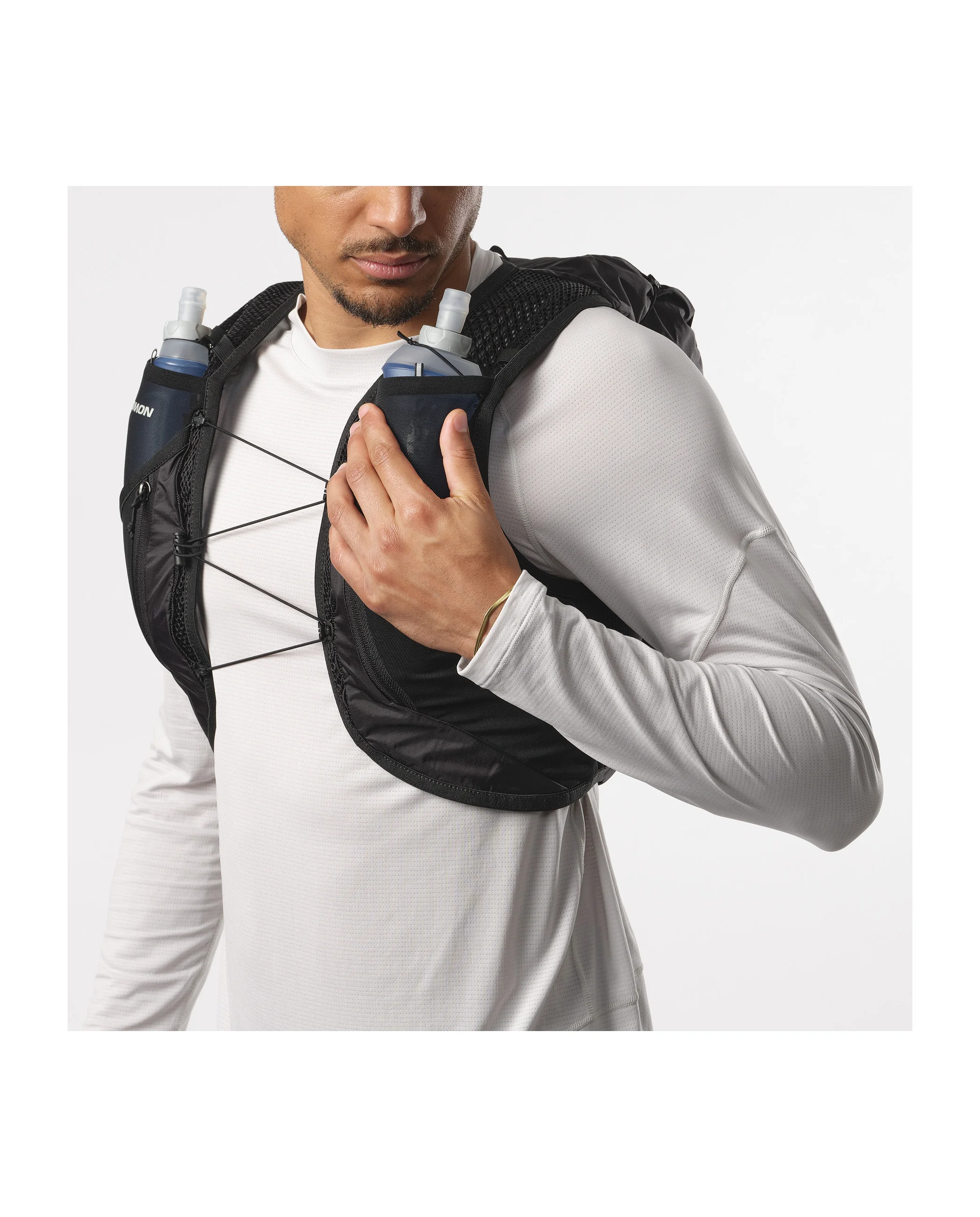 To provide a stepping stone to take your trail running to the next level for ultra-distances, we launched the ACTIVE SKIN 12 – the biggest volume yet in this range. The fabrics are soft and breathable, the fit is ultra-secure, and the chest pockets provide effortless access to your flasks. FEATURES & FABRICS - CONCEPT & TECHNOLOGY - Sensifit™: The construction uses stretch, breathable fabrics and lightweight adjustments to optimize fit and stability. - LOAD MANAGEMENT - Quick link: This sternum strap enables you to adjust your pack quickly on the fly. The elastic makes it easier to breathe when you pick up the pace. - HYDRATION: 2 soft flasks 500 ml 28 included - BACK SYSTEMS: 3D comfort - LOAD MANAGEMENT: Side compression laces adjustable - SHOULDER STRAPS - 3D Airmesh shoulder straps: With a construction that incorporates small cavities, 3D Airmesh panel allows enhanced air circulation. - HYDRATION - Reservoir compartment: This item contains an internal reservoir compartment with a hanging strap to hold the reservoir in place. - HYDRATION - Reservoir tube exit: Sewn-in exit port for a hydration tube. - HYDRATION: Compatible with 1.5l reservoir - POCKETS & COMPARTMENTS: 1 back compartment - POCKETS & COMPARTMENTS: 1 internal pocket - POCKETS & COMPARTMENTS - 2 front stretch pockets: Expandable front pockets to store essentials you want to access on the go. - POCKETS & COMPARTMENTS - 2 front zipped pockets: Ideal for more accessible volume - POCKETS & COMPARTMENTS: 1 back expandable mesh pocket - OPENING & CLOSURE - Large opening: Salomon bags have a large opening to make it easy to see and store your gear. - CARRYING SYSTEM - Custom quiver compatible: Upgrade your pack with the custom quiver, providing quick access and stable carrying for your poles. It's ready to connect. - CARRYING SYSTEM - Custom quiver connecting system: Hooks on the quiver connect to loops on the Sense packs. - CARRYING SYSTEM - Key holder: This elastic key chain holder makes it easy to pull keys off the bag while remaining safely attached. - FABRICS - 3D air mesh: Soft 3D mesh adapts to your body on the move, without rubbing your skin or tee-shirt. Larger holes maximize comfort and breathability. - FABRICS - Elastic power mesh: Highly stretch and breathable fabric that adapts to the body. - FABRICS - Fast wicking fabrics: Improving quick drying and moisture management, these light fabrics deliver top performance, comfort, and odor resistance. Back insert 89% Polyamide, 11% Elastane Body insert 88% Polyamide, 12% Elastane Back body 100% Polyester Lining 100% Polyamide Body 100% Polyamide Article ref. LC2177600