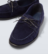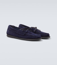 Turn to Saman Amel for modern designs with an emphasis on masterful craftsmanship, impeccable quality, and timeless refinement. The City Moc boat shoes are made in Italy from blue suede with contrasting black laces for fastening. Product Details - Upper: leather (suede) - Lining: leather - Sole: leather insole, rubber sole - Color: blue - Toe shape: almond toe - Handmade in Italy - Includes: shoe box, dust bag - Designer color name: Navy - Item color: blue - Item number: P01048876 Size & Fit - Fits slightly large to size - we recommend trying a half size smaller - European sizes
