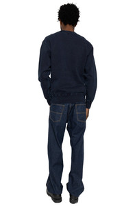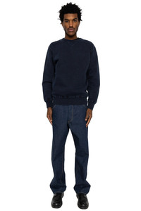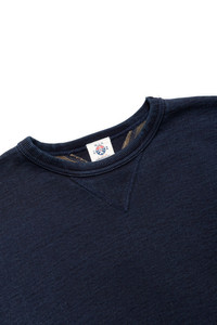 - Color : Kakishibu (persimmon tannin) x Indigo - 30-count open-end yarn, indigo rope dyed. - By using open-end yarn, which is spun using air pressure, the fabric has a dry texture with a firm rope-like feel due to the air trapped within the yarn. The same yarn is used for the ribbing as well. - The garment is garment-dyed using natural persimmon tannin dye, which has been used in clothing since the Heian period. The components of persimmon tannin provide antibacterial properties and increased colorfastness, and the tannins in particular cause the color to deepen and develop a richer hue with wear. - The sewing specifications utilize a 4-needle flatseamer sewing machine, with the blade adjusted to allow the persimmon tannin color to show through on the outside of the garment. - Double-needle binder neck - Please note that due to the use of natural dyes, there may be slight variations in color. - Made in Japan - 100% cotton - Model is 6'2 wearing a size L