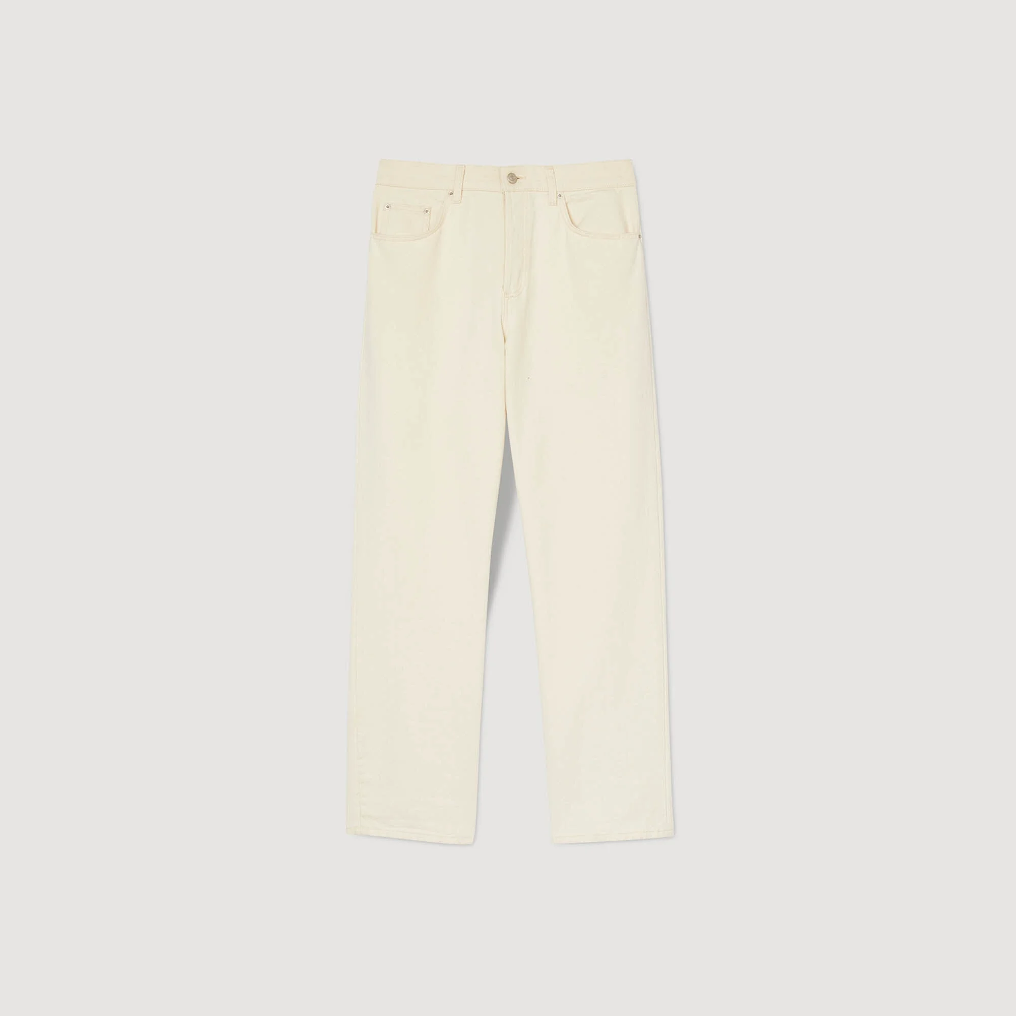 Straight-leg cotton jeans with 5 pockets and an embossed Sandro leather jacron label at the back. • Sandro Men's cotton jeans • 5 pockets • Zip and button fastening • Leather jacron label at the back Model is wearing a size 29 and is 6'2'' The cotton in this item was produced organically via a cultivation method that preserves biodiversity and bans the use of pesticides and GMOs. The model is 189 cm / 6'2 tall and wears a size 29 COMPOSITION Main fabric: 100% cotton Pocket lining: 65% polyester, 35% cotton Reference: SHPJE00452_11