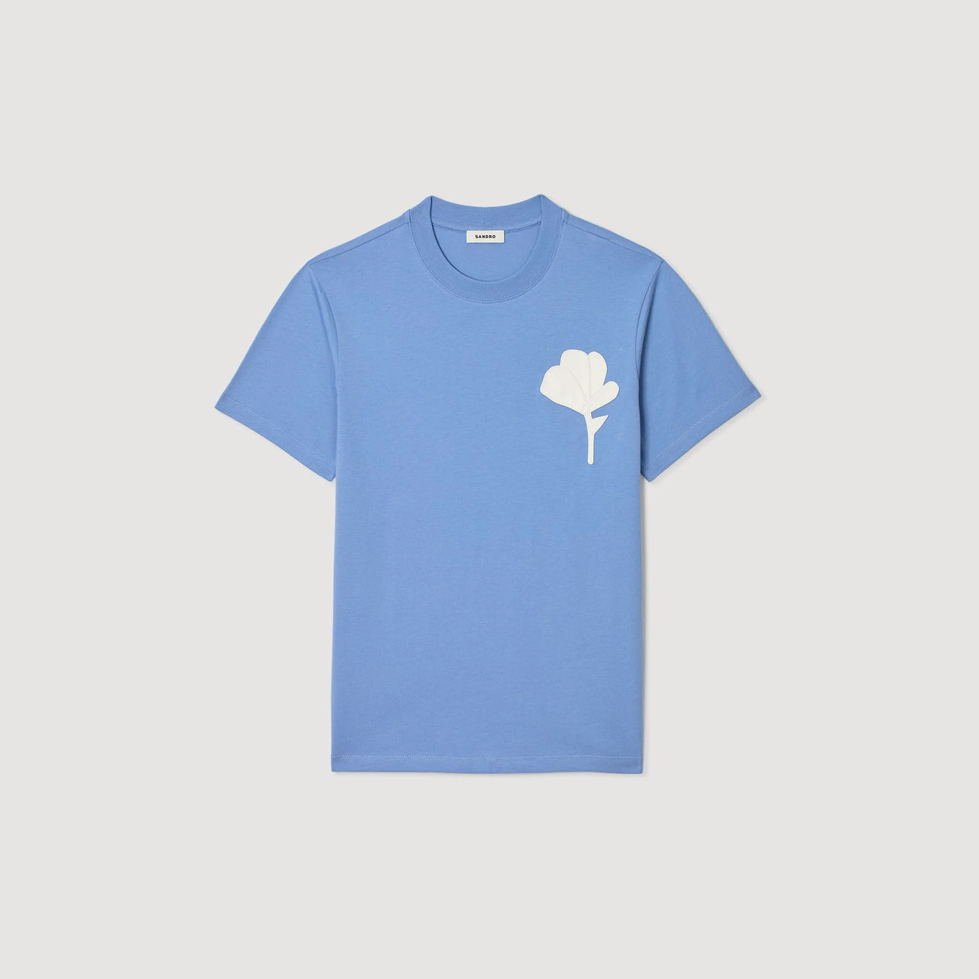 Round-neck, short-sleeved T-shirt with a flower patch on the chest. - Sandro Men's cotton T-shirt - Classic fit - Round neck - Short sleeves - Flower patch - True to size Reference: SHPTS01734_D348 COMPOSITION & CARE Composition - Main fabric: 100% cotton - Rib: 100% cotton Care advice - Gentle cycle 30° - Do not bleach - Do not tumble dry - Iron at a maximum temperature of 110°C without steam - Do not dry clean
