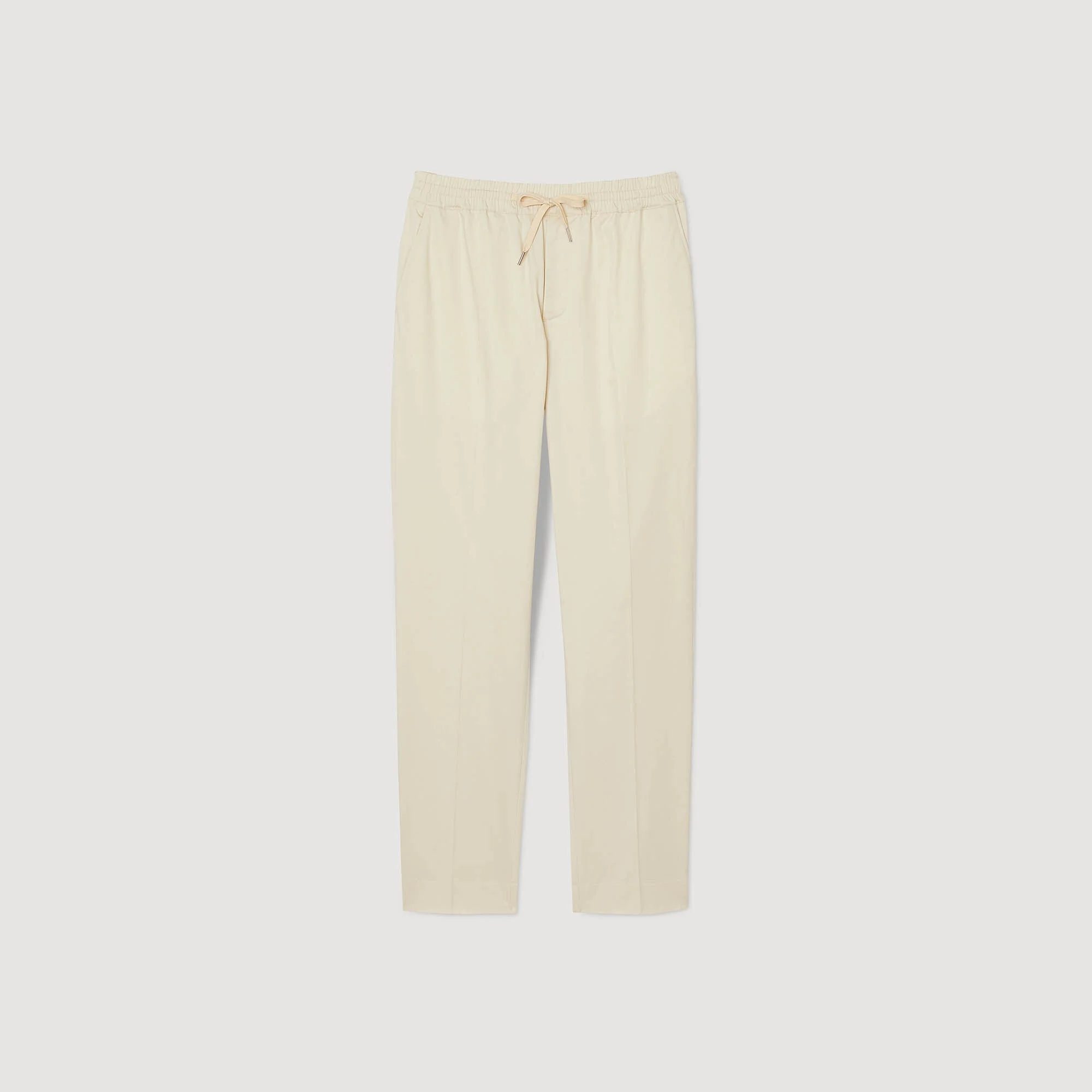 Straight-leg pants with an elasticated drawstring waist and side pockets. Sandro Men's straight-leg pants Elasticated waist Drawstring 2 side pockets 2 back pockets Model is wearing a size 38 and is 6'3'' Model is wearing a size 38 and is 6'2'' The model is 185 cm / 6'1 tall and wears a size 38 / 28 US COMPOSITION Main fabric: 63% cotton, 35% lyocell, 2% elastane Pocket lining: 100% cotton Reference: SHPPA01116_1611