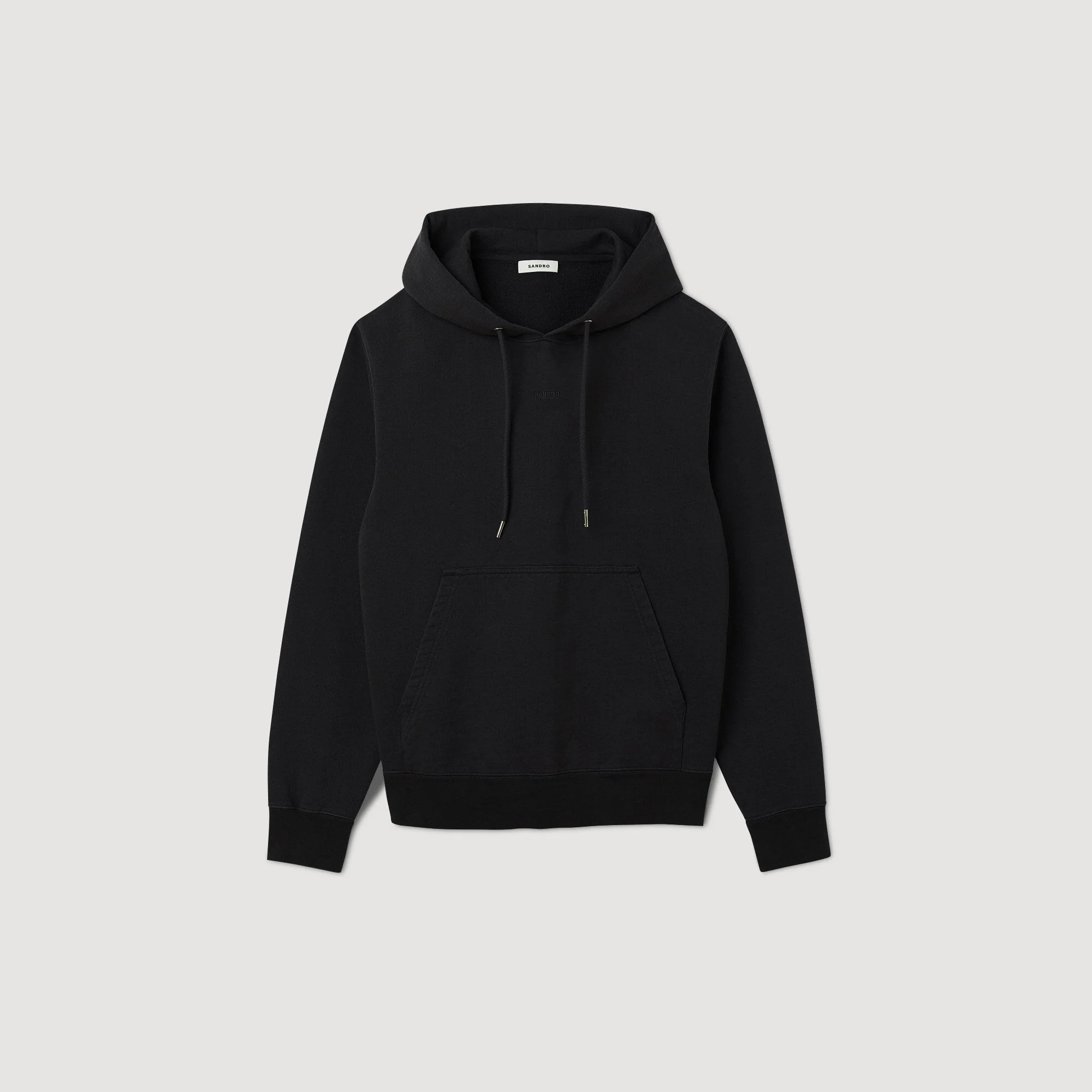 Hoodie with a drawstring hood, long sleeves and Sandro embroidery on the front. Sandro Men's logo hoodie • Drawstring hood • Straight cut • Long sleeves • Sandro logo embroidery • Brushed fleece • Kangaroo pocket • Ribbed edging on the cuffs and waist Women model is wearing a size S Men model is wearing a size S br>Model is wearing a size S and is 6'3'' Sandro is committed to ever more responsible fashion. As part of our traceability project in partnership with Fairly Made, we openly reveal information on the origin, manufacture and environmental impact of our clothing. Every stage of manufacturing and processing this sweatshirt was carried out in Portugal, using organic cotton from fields located in Turkey. It has a traceability score of: 4.2/5. The cotton in this item was produced organically via a cultivation method that preserves biodiversity and bans the use of pesticides and GMOs. The model is 187 cm / 6'1 tall and wears a size S / 8 UK COMPOSITION Main fabric: 100% cotton Embroidery: 100% polyester Rib: 97% cotton, 3% elastane Reference: SHPSW00458_20
