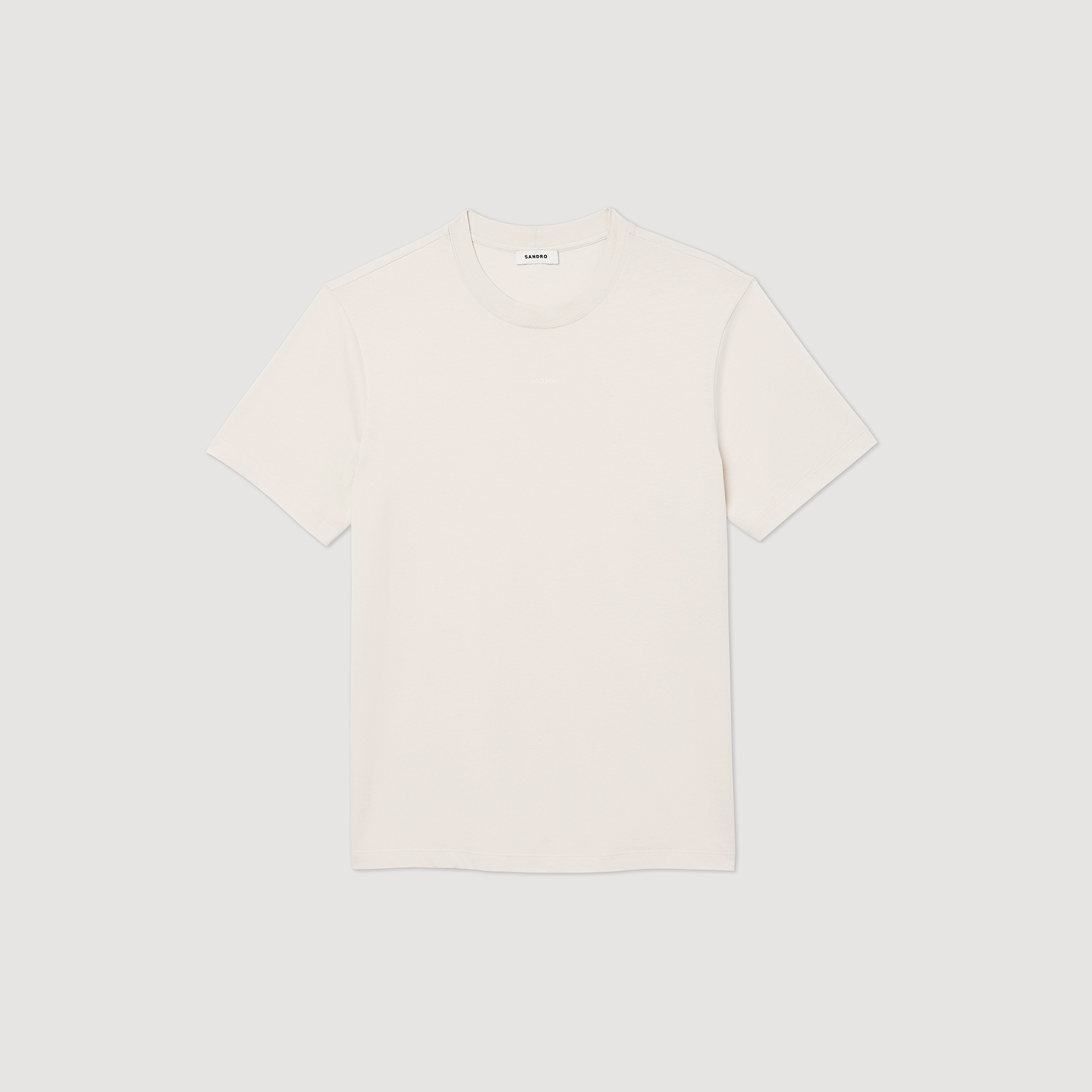 Round-neck short-sleeved T-shirt with SANDRO embroidery on the front. Sandro Men's cotton T-shirt • Embroidered Sandro logo on the front • Short sleeves Model is wearing a size S and measures 185 cm The cotton in this item was produced organically via a cultivation method that preserves biodiversity and bans the use of pesticides and GMOs. Sandro is committed to ever more responsible fashion. As part of our traceability project in partnership with Fairly Made, we openly reveal information on the origin, manufacture and environmental impact of our clothing. All aspects of manufacturing and processing this T-shirt were carried out in Turkey, using organic cotton from fields in Kyrgyzstan. It has a traceability score of: 4.3/5 Model is wearing a size S and is 6'3'' Reference : SHPTS00990 MATERIALS Main fabric: 100% cotton Rib: 100% cotton