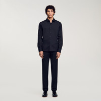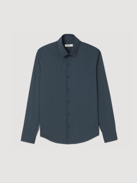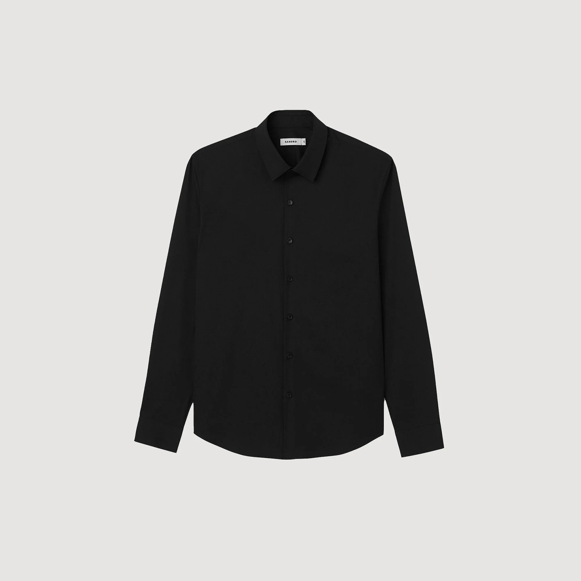 Fitted stretch cotton shirt with long sleeves, buttoned cuffs, a classic collar, and a button fastening. Sandro Men's stretch cotton shirt Fitted cut Long sleeves Buttoned cuffs Button fastening Model is wearing a size S and is 6'2'' COMPOSITION Main fabric: 78% cotton, 18% polyamide, 4% elastane Buttons: 100% vegetable ivory Reference: SHPCM00858_20