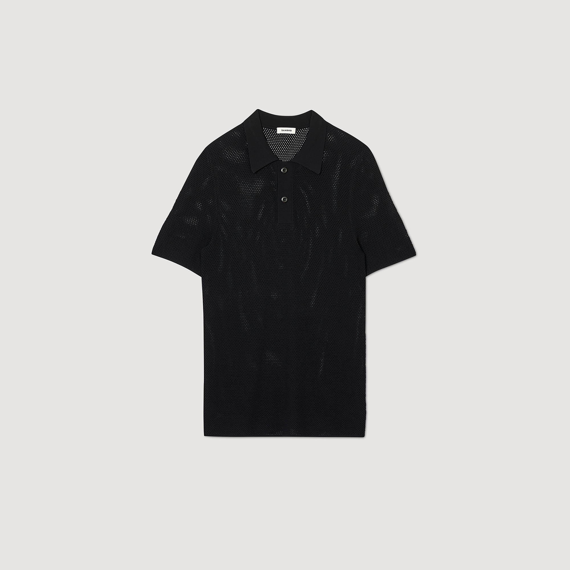 Long polo shirt in semi-sheer openwork knit, with button-down polo collar and short sleeves. Sandro Men's openwork knit polo shirt Long cut Short sleeves 2-button polo shirt collar Reference : SHPTR00531 MATERIALS Main fabric: 80% viscose, 20% polyamide Collar: 79% viscose, 19% polyamide, 2% elastane