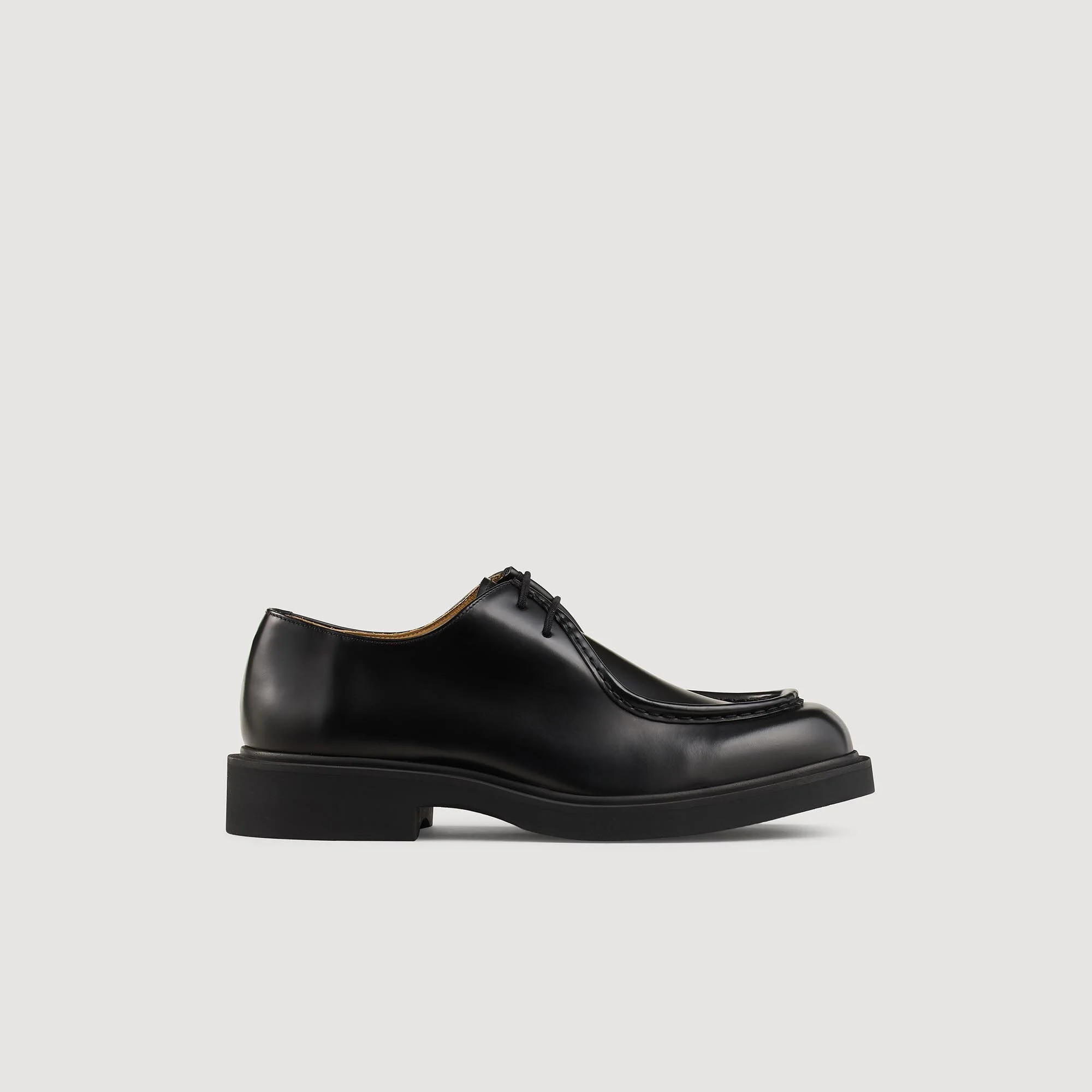 Slightly square-toed patent leather lace-up dress shoes with rubber soles and heels featuring a SANDRO logo on the back. - Sandro Men's patent leather dress shoes - Made in Portugal - Laces - Rubber soles - Heel with logo on back - Hand-sewn apron \COMPOSITION & CARE Leather: calfskin Lining: cow Sock lining: calfskin Outer sole: 100% rubber Insole: calfskin