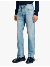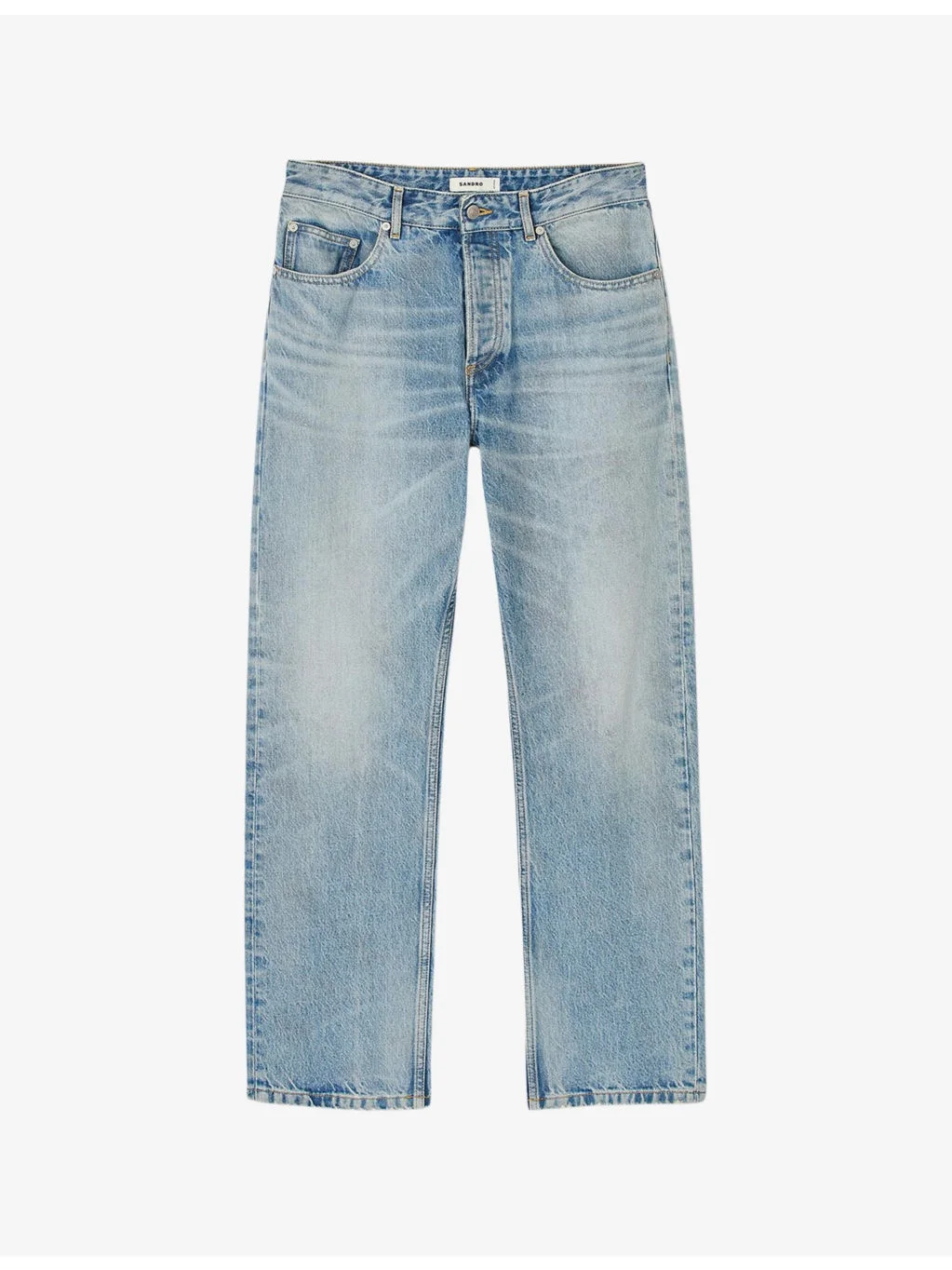 PRODUCT DETAILS - Sandro denim jeans - 100% cotton - Exposed button and concealed zip-fly fastening at front - Regular fit, mid-rise, straight leg, structured waistband with belt loops, five pockets, leather logo patch at back, faded effect, light wash - Machine wash at 30°C - Model is 6ft 2in/1.88m and wears a size UK 30 - Midweight, non-stretch Ref: R04323701