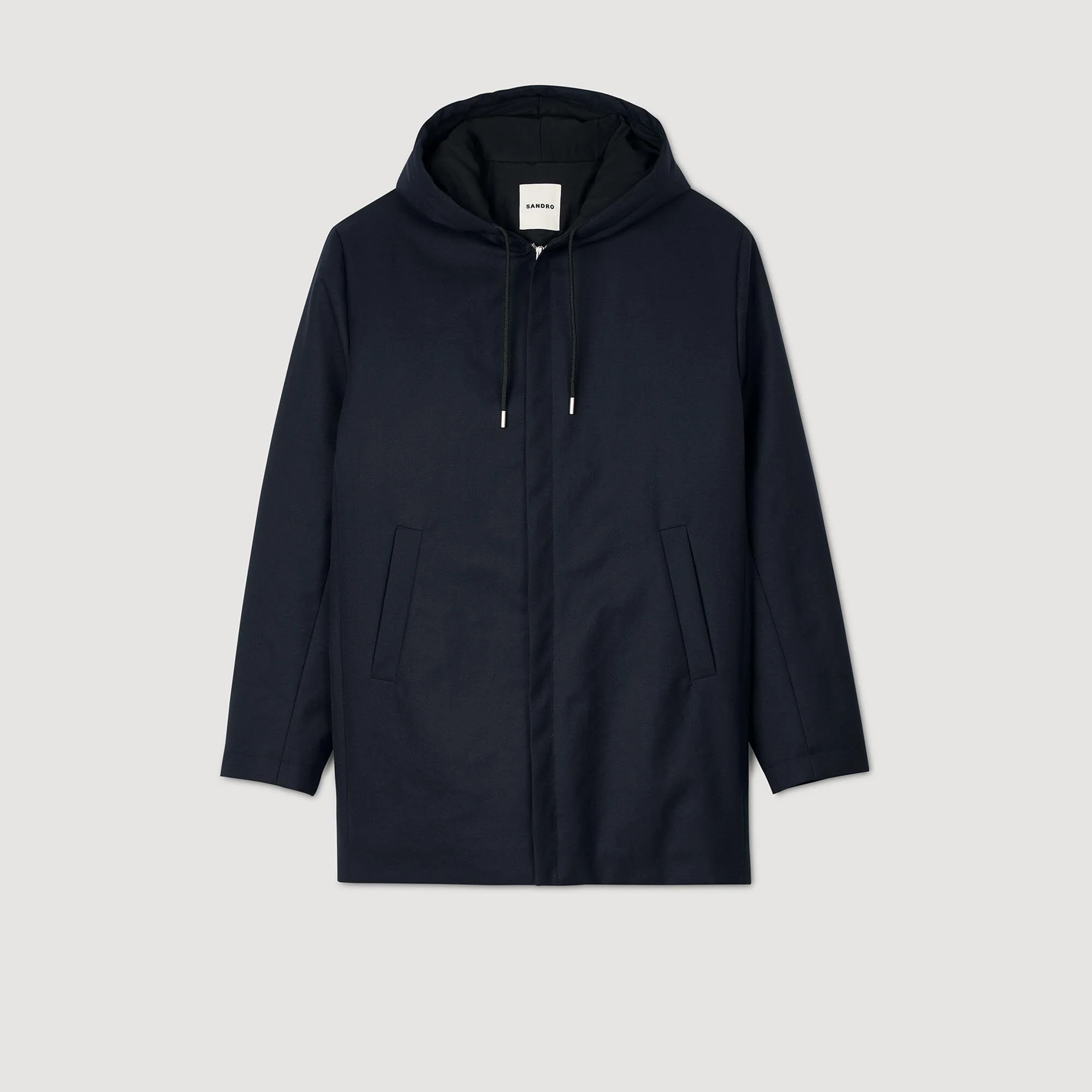 Zipped, quilted parka made from a water-repellent technical fabric, with a drawstring hood and long sleeves. - Sandro Men's quilted zip-up parka - Water-repellent technical fabric - Drawstring hood - Long sleeves - Lined - 2 inside pockets Reference: SHPMA00366_44 COMPOSITION & CARE Composition - Main material: 55% polyester, 45% wool - Coating: 100% polyurethane - Body lining: 60% cotton, 40% polyamide - Sleeve lining: 100% viscose - Pocket lining: 100% cotton - Padding: 60% polyester, 40% polyester wadding Care advice - Do not wash - Do not bleach - Do not tumble dry - Iron at a maximum temperature of 110°C without steam - F/ - Professional dry clean, with hydrocarbon solvent, gentle treatment