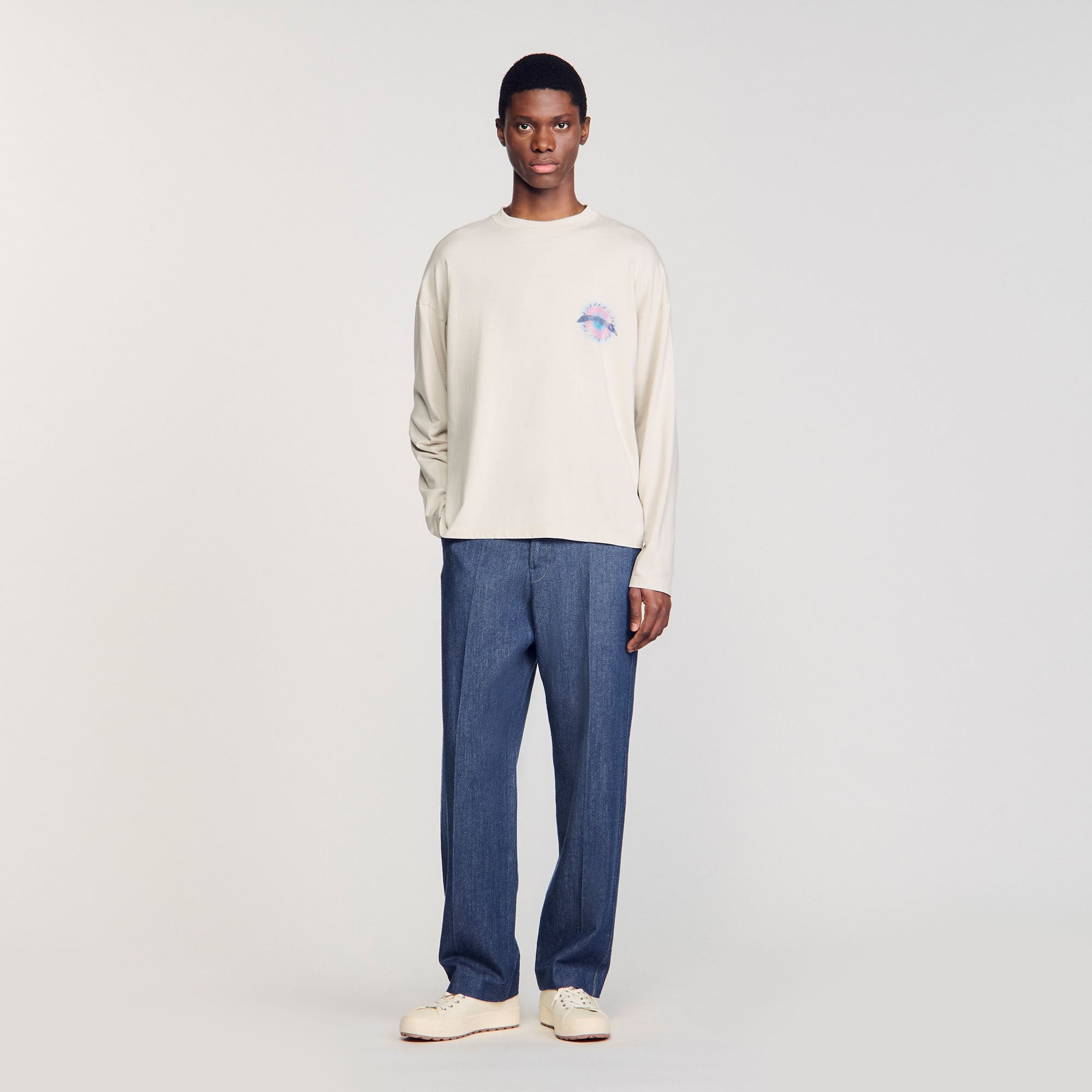 Long-sleeved round-neck T-shirt with sun print on front. - Sandro Men's oversized T-shirt - Sun motif chest print - Round neck - Long sleeves Reference: SHPTS01642_B309 COMPOSITION & CARE Composition - Main fabric: 100% cotton - Rib: 100% cotton Care advice - Gentle cycle 30° - Do not bleach - Do not tumble dry - Iron at a maximum temperature of 110°C without steam - Do not dry clean