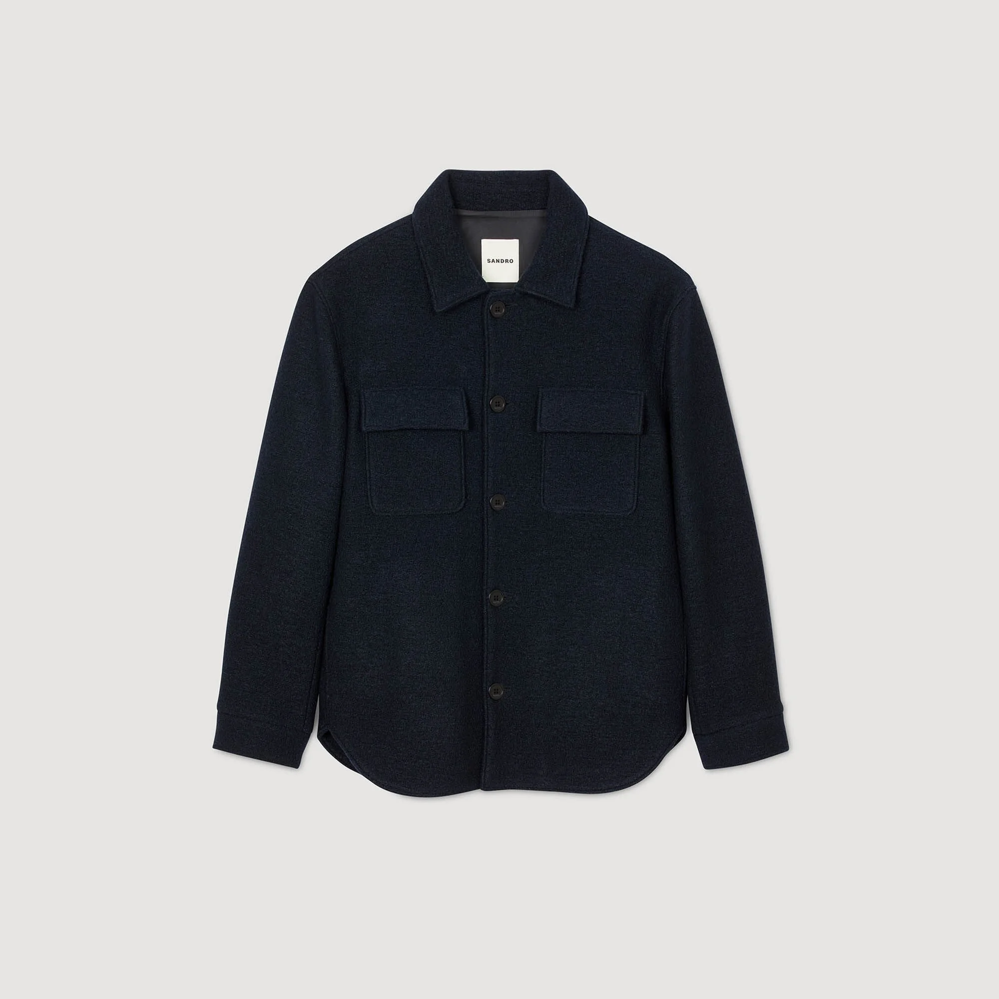 Virgin wool overshirt with wing collar, button fastening, long sleeves, and patch pockets with flaps. - Sandro Ready-to-wear overshirt - Wing collar - Long sleeves - Button fastening - Patch pockets with flaps - True to size Reference: SHPBL01176_125 COMPOSITION & CARE Composition - Main material: 100% virgin wool - Lining: 100% viscose - Pocket lining: 100% cotton Care advice - Do not wash - Do not bleach - Do not tumble dry - Iron at a maximum temperature of 110°C without steam - F/ - Professional dry clean, with hydrocarbon solvent, gentle treatment