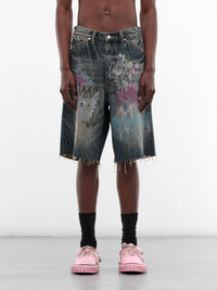 Blue denim shorts with faded construction and graphic graffiti spray paint print. Featuring: • Baggy fit • Wide leg • Knee-length • Belt loops and back logo patch • Front button and zip fly closure • Five-pocket styling • Raw hems • 100% Cotton • Standard sizing Model is 6’2” wearing size M. Shoulders: 19” Chest: 38” Waist: 28”