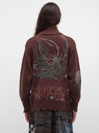 A brown cotton sweater with distressed detailing and graffiti motifs. The turtleneck and two-way zip create a worn-in reinterpretation of classic knitwear. Featuring: • Relaxed fit • Cotton knit construction • Graffiti graphic print • Heavy distressing • Ribbed turtleneck • Two-way zip closure with knife pull • Dropped shoulders and long sleeves • Rib-knit cuffs and hem with side pockets • Made in China • 100% Cotton • Standard sizing Model is 5'11.5" wearing size L. Shoulders: 18" Chest: 36" Waist: 30"