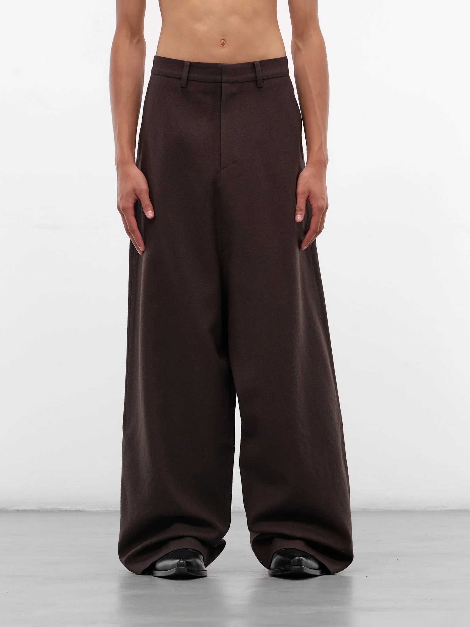 Brown wool trousers with a soft drape and wide leg. The lined interior and tailoring finish the classical design with a modern baggy silhouette. Featuring: • Baggy fit • Wool construction • Mid-waist silhouette • Belt loops • Concealed zip fly closure • Four-pocket styling • Lined interior • Wide leg • Made in China • Outer: 100% Virgin Wool | Inner: 100% Cotton • Standard sizing Model is 5'11.5" wearing size M. Shoulders: 18" Chest: 36" Waist: 30"