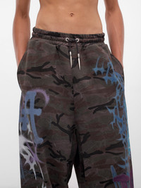 Dark brown and green camouflage pants with graffiti graphics and wide-leg proportions. The elastic waistband and drawstring finish balance comfort with bold graphics. Featuring: • Relaxed fit • Cotton construction • Camouflage pattern with graffiti graphic print • Elasticated waistband with adjustable drawstring • Knife aglets • Side pockets and back patch pocket • Wide leg • Made in China • 100% Cotton • Standard sizing Model is 5'11.5" wearing size M. Shoulders: 18" Chest: 36" Waist: 30"