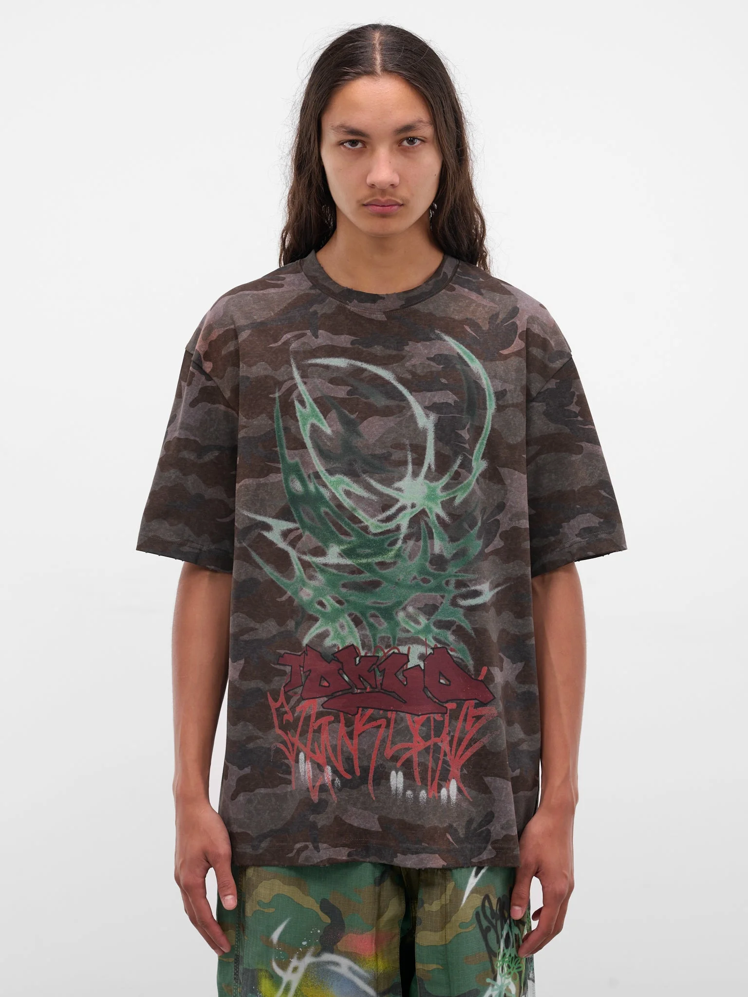 A green and brown camouflage T-shirt with graffiti graphics and light distressing. Featuring: • Relaxed fit • Cotton-poly construction • Camouflage pattern with graffiti graphic print • Light distressing • Crewneck • Short sleeves • Made in China • 80% Cotton 20% Polyester • Standard sizing Model is 5'11.5" wearing size M. Shoulders: 18" Chest: 36" Waist: 30"