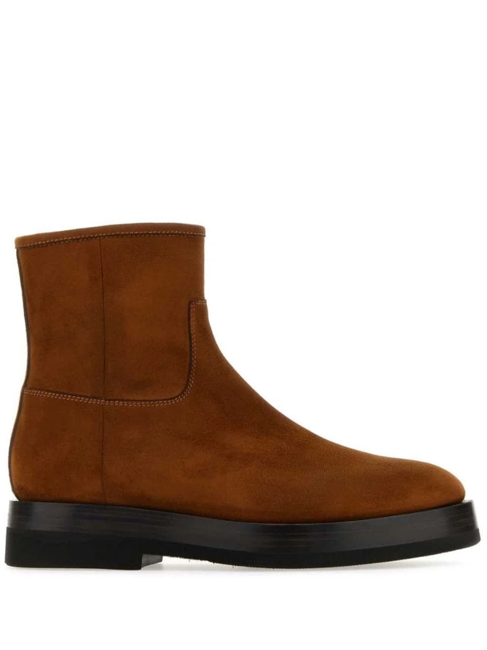 suede ankle boots Highlights - Brown - Suede - Contrast stitching - Panelled design - Round toe - Ridged rubber sole - Ankle-length - Slip-on style Made in Italy Composition Outer: Calf Suede 100% Lining: Fabric 100% Sole: Rubber 100%