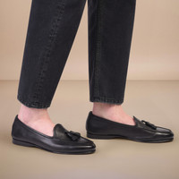 A loafer dedicated to those seeking lightweight elegance without compromising on luxurious materials and workmanship. Reinterpreting an archival classic, this iteration flaunts a sleek design with a low-cut silhouette that leaves the ankle bare, supported with an elegantly bevelled heel. Its soft nappa-esque leather construction is elevated with tassel embellishments and a stitched toe box. Designed with a special Goodyear welt construction for an ultra-soft, flexible feel. Product details Product ID: MCAN18515PA1BSLFN01 - Men's loafer - Crafted from leather - Treated with Santoni’s “velatura” color-grading technique - Color: black - Tassels - Raised apron stitching - Classic silhouette with tapered toe - Goodyear welt construction - Leather sole with half rubber heel - Printed Santoni logo on the insole - Made in Italy