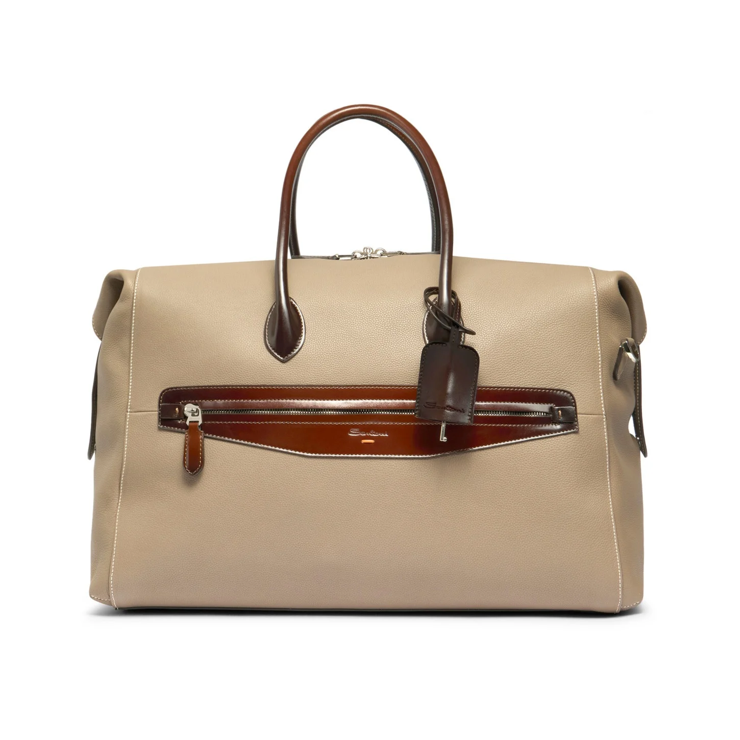 Showcasing a light, deconstructed silhouette, this Santoni bag brings refined elegance to off-duty looks and weekend trips. Its tumbled leather construction boasts a luxuriously tactile feel, elevated with padded handles and a detachable shoulder strap. Zip pockets on the inside and outside keep everything safe and organised. Product details Product ID: UIBBA2646BSACSUE81 - Crafted from tumbled leather - Color: beige - Padded handles - Two-way zip closure - Inside zip pocket - Front zip pocket - Adjustable and detachable shoulder strap - Charm with decorative key - Debossed Santoni logo - Dimensions: 45,5cm x 28cm x 26cm - Made in Le Marche, Italy