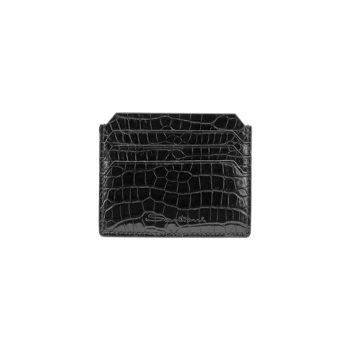 Crafted from fine alligator leather, this Santoni cardholder brings exclusive elegance to the everyday. Its flat silhouette is easy to slip into your pocket or handbag, designed with a central pocket and three side compartments. Product details Product ID: UFPPA2693FOADVON01 - Made from alligator leather - Color: black - Central pocket - 3 card slots per side - Debossed Santoni logo on the front - Made in Le Marche, Italy