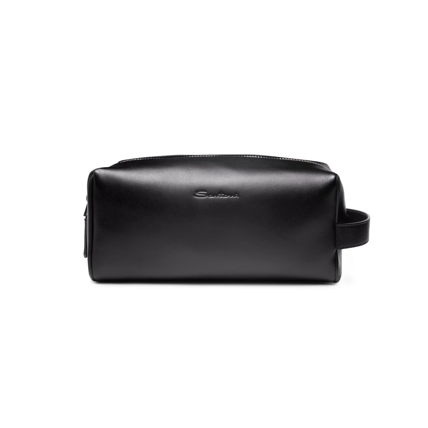 Compact proportions and iconic workmanship define this Santoni pouch, enriching moments of beauty and travel with refined elegance. Crafted from leather, it showcases our signature “velatura” finish: an artisanal treatment that creates an elegant gradated effect. Complete with a handle on one side, adding to the design’s functional allure. Product details Product ID: UIBBA2368DBAAFYN01 - Crafted from leather - Treated with Santoni’s “velatura” color-grading technique - Color: black - Zip closure - Fabric lining - Embossed Santoni logo on the front - Made in Le Marche, Italy
