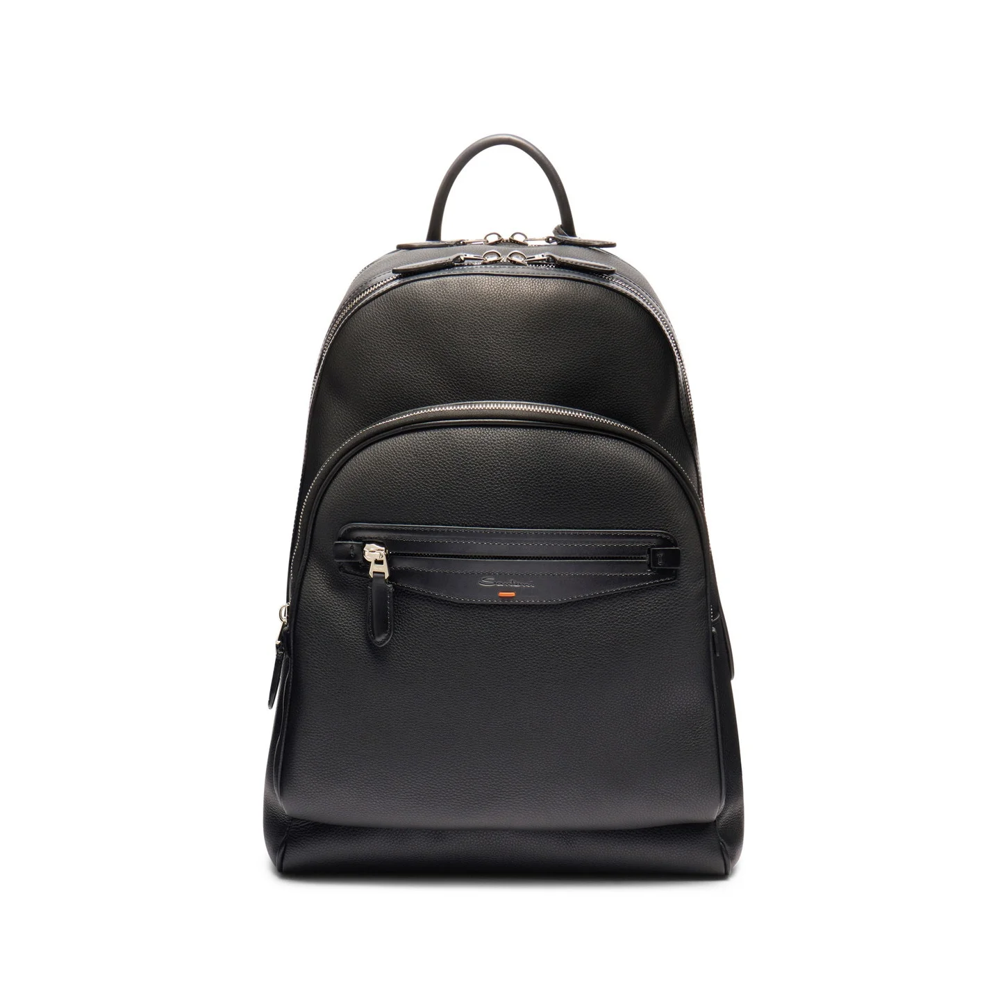 Structured and stylish, this men’s backpack is perfect for city breaks and business trips. Its rich tumbled leather construction is enriched with hand-nuanced leather details and thoughtfully placed pockets to keep your belongs organised. The strap on the back slips over the handle of your suitcase for convenience, while the padded and adjustable straps make it easy to adjust to the perfect fit. Product details Product ID: UIBBA2647BSACUHN01 - Crafted from tumbled leather - Leather details with “velatura” gradated finish - Color: black - Top handle - 2 inside compartments - Inside zip pocket - Front zip pocket - Adjustable shoulder straps - Suitcase attachment strap - Two-way zip closure - Debossed Santoni logo - Arancio Santoni leather stitch - Made in Le Marche, Italy