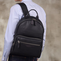 Dynamic and sophisticated, the Santoni men's backpack is perfect for running city errands and informal work events alike. Crafted from tumbled leather, it boasts a whole host of inside and outside pockets to keep your belongings tidy and organised. Product details Product ID: UIBBA2364ENA2IBN01 - Men’s backpack - Crafted from tumbled leather - Leather details treated with Santoni’s “velatura” colour-grading technique - Colour: black - Two inside compartments - Front zip pocket - Adjustable straps - Two-way zip closure - Tonal debossed Santoni logo - Dimensions: 36 cm x 49 cm x 25 cm