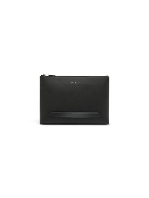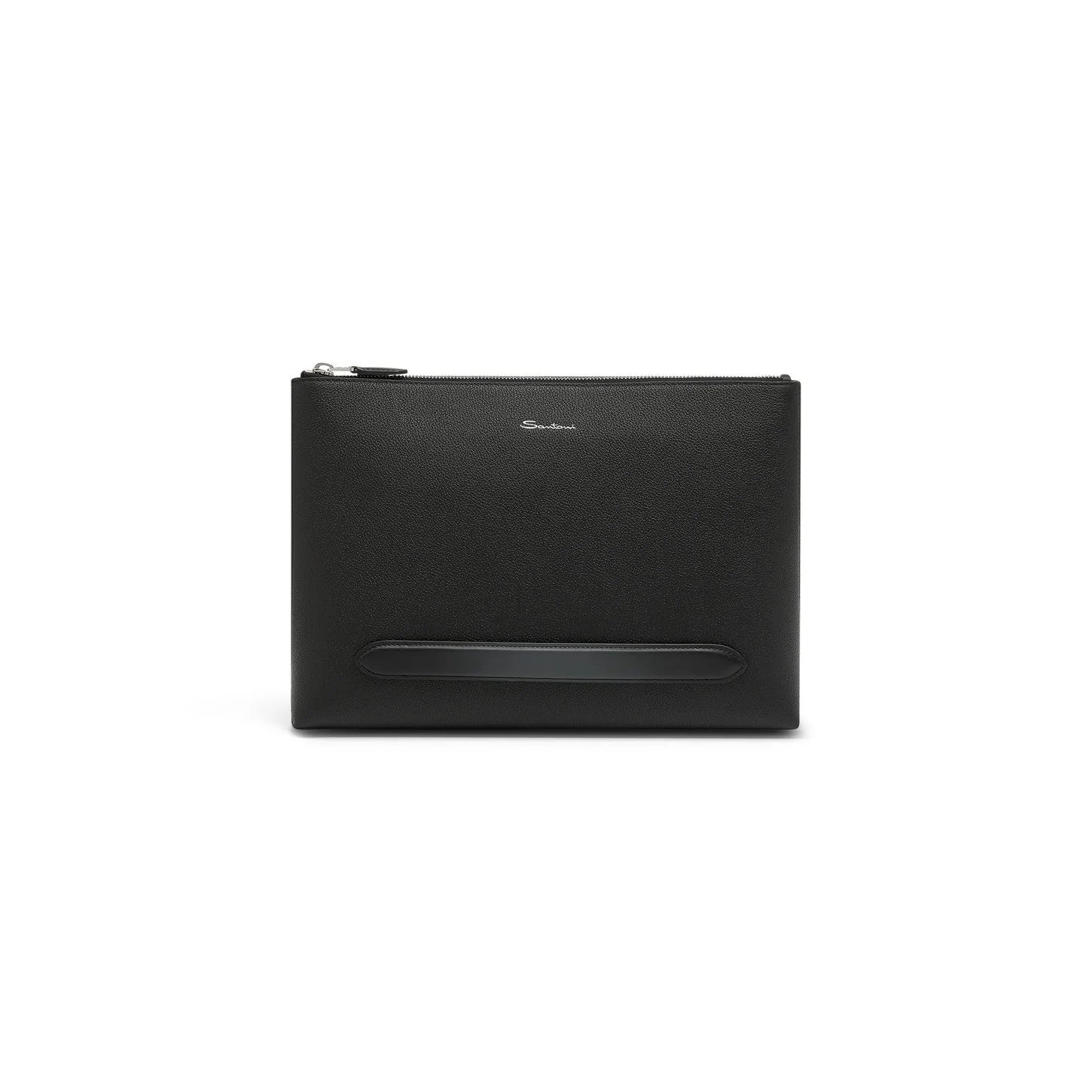 A refined accessory that exudes Santoni’s devotion to quality and perfection in every detail. This tumbled leather features a handle on the front, firmly securing it in the palm of your hand. Equipped with an inside pocket and a zip closure. Product details Product ID: UFPPA2588FOACSUN01 - Crafted from tumbled leather - Color: black - Zip closure - Inside pocket - Leather handle treated with Santoni’s “velatura” technique - Debossed Santoni logo - Dimensions: 32cm x 25cm x 3cm - Made in Le Marche, Italy