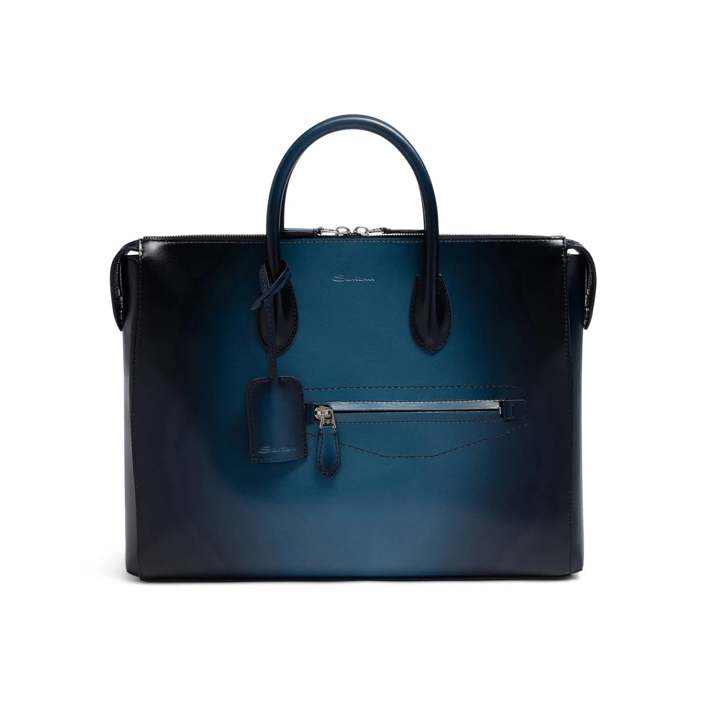 This sophisticated Santoni bag is a refined companion for work meetings and business trips. Its fine leather construction is treated with the brand’s prestigious “velatura” technique: a hand-applied gradated finish. Pockets on the inside and outside keep its contents organised, whilst a detachable shoulder strap ensures maximum versatility. Product details Product ID: UFBBA2645BSAPXPU21 - Crafted from leather - Treated with Santoni’s “velatura” color-grading technique - Color: blue - Padded handles - Two-way zip closure - Inside zip pocket - Front zip pocket - Adjustable and detachable shoulder strap - Charm with decorative key - Debossed Santoni logo - Dimensions: 37cm x 28cm x 7cm - Made in Le Marche, Italy