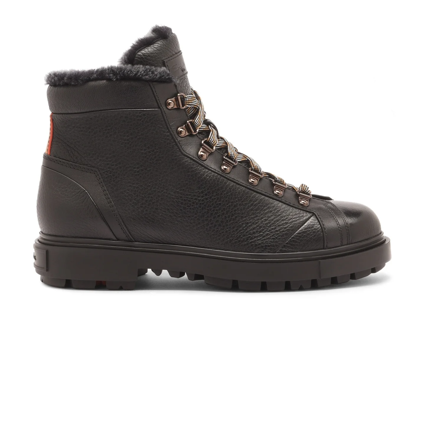 Functional design meets meticulous attention to detail to add an exclusive touch to your off-duty edit. This Santoni ankle boot is crafted from tumbled leather and lined in soft shearling for superior protection on winter’s coldest days. Hiking-style criss-cross laces and eyelets toughen up the look with outdoorsy attitude, whilst contrast details on the rubber sole reveal a flash of signature Santoni orange with every stride. Product details Product ID: MGSM18190NERAYLWN01 - Men’s ankle boot - Crafted from tumbled leather - Color: black - Criss-cross laces and inner side zip - Hiking-style eyelets - Fur lining - Rubber sole - Printed Santoni logo on the insole - Made in Italy