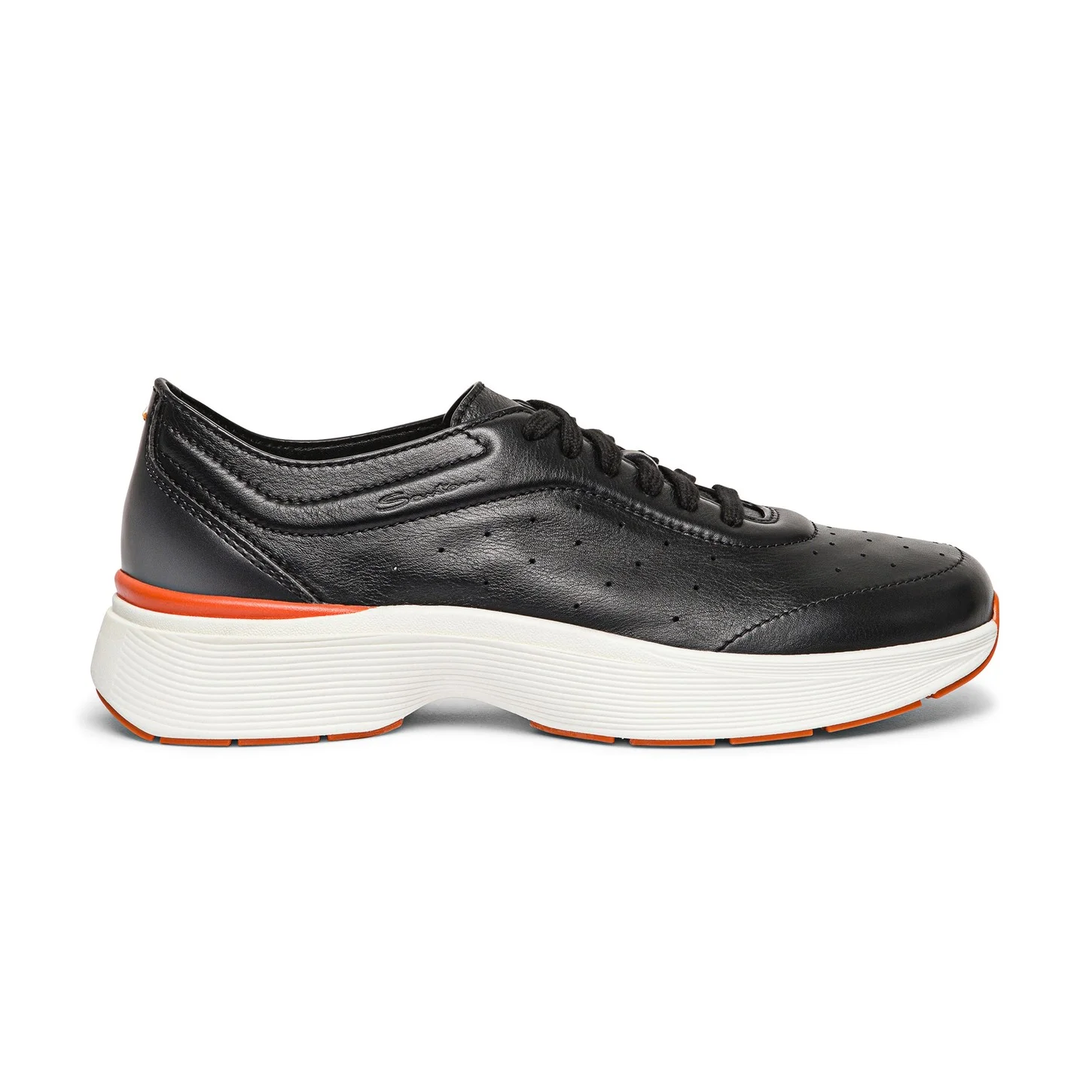 A robust running silhouette, imbued with the enduring excellence of Santoni’s artisanal legacy. Slender yet supportive, the Easy Bounce sneaker features a chunky rubber sole with grip panels on the tread. Detailed with delicate perforations on each side, this iteration is crafted from incredibly supple Ultratouch leather, molding effortlessly to the foot for a glove-like fit. The leather heel reinforcement is treated with our iconic Velatura color-graded finish and hallmarked with a distinctive Sigillo stitch in Arancio Santoni — the Maison’s signature orange hue. Product details Product ID: MBBC22070BARTOILN01 - Crafted from Ultratouch leather - Color: Fumo Black - Leather heel tab with Velatura color-graded finish - Lace-up fastening - Lightweight rubber running sole - Arancio Santoni Sigillo stitch - Lug tread with Arancio Santoni orange detail - Made in Italy