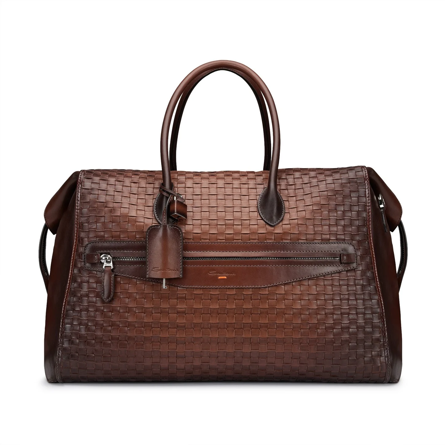 This woven leather weekend bag is an ode to the Maison’s “Intrecci” workmanship: an authentic expression of the Santoni philosophy, evoking its values, artisanal culture and aesthetic sensitivity to transform a simple accessory into a miniature manifestation of technical mastery and beauty. Enriched by hand with the chromatic depth of the Maison’s iconic Velatura technique, it features padded handles and a detachable shoulder strap that adjusts to your desired length. Zipper pockets on the inside and outside keep its contents neat and organized, while Sigillo stitching signs off the design with Santoni’s iconic seal of perfection. Product details Product ID: UIBBA3001BSAJNWT50 - Crafted from leather - Treated with Santoni’s Velatura color-graded finish - ”Intrecci” woven construction - Color: Quercia Brown - Padded handles - Two-way zip closure - Inside zip pocket - Front zip pocket - Adjustable and detachable shoulder strap - Removable padlock and key charm - Santoni logo - Leather Sigillo stitching - Dimensions: 50 cm x 30 cm x 31 cm - Made in Italy