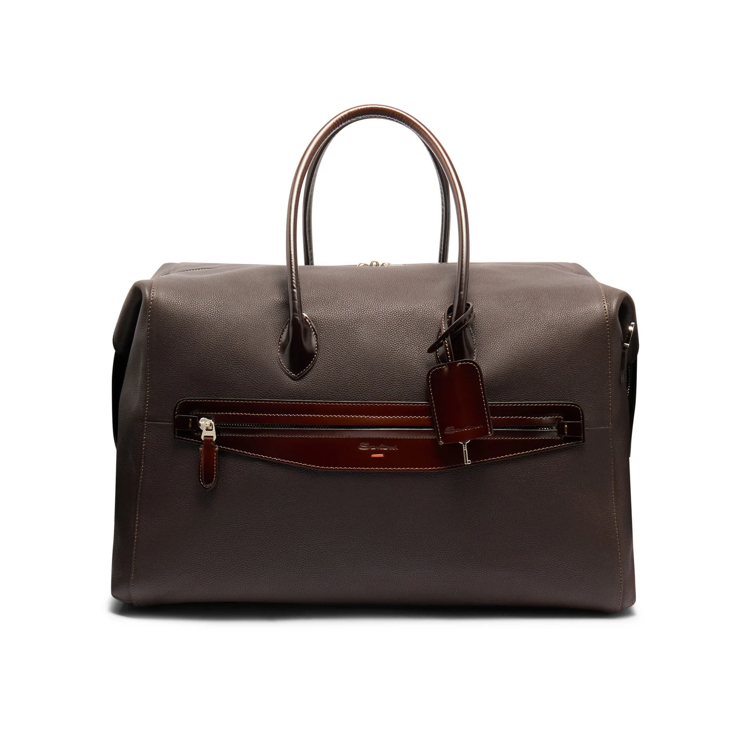 Showcasing a light, deconstructed silhouette, this Santoni bag brings refined elegance to off-duty looks and weekend trips. Its tumbled leather construction boasts a luxuriously tactile feel, elevated with padded handles and a detachable shoulder strap. Zip pockets on the inside and outside keep everything safe and organised. Product details Product ID: UIBBA2646BSACSUT50 - Crafted from tumbled leather - Color: dark brown - Padded handles - Two-way zip closure - Inside zip pocket - Front zip pocket - Adjustable and detachable shoulder strap - Charm with decorative key - Debossed Santoni logo - Dimensions: 45,5cm x 28cm x 26cm - Made in Le Marche, Italy