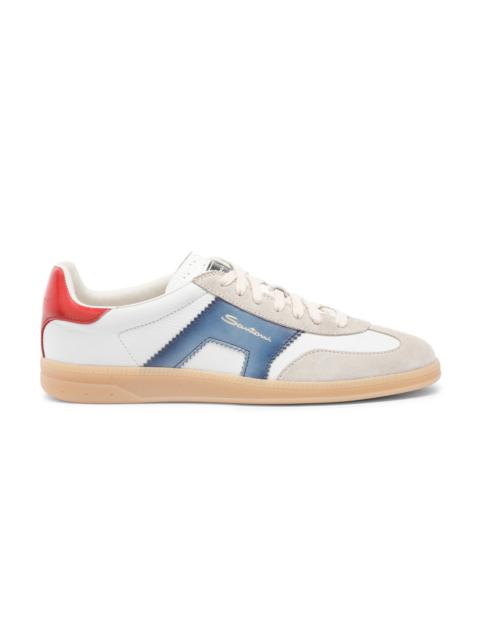 Inspired by an archival design, this DBS Oly Sneaker flaunts a retro look that nods to classic tennis shoes from the ‘70s. Distinguished by an elegant, lightweight silhouette, this men’s style is crafted from leather with suede overlays on the toe and eyestay. The gradated leather side detail with zig-zag edges is inspired by one of our signature codes—the double buckle—lifted from our formal shoe edit and transformed into a mark of modern style. Complete with a slim natural-toned rubber sole to accentuate its retro charm. Product details Product ID: MBPL21965FARCNOCI32 - Men's low-top sneaker - Crafted from leather and suede - Colour: white, grey and blue - Double-buckle-inspired leather side detail - Subtle double-buckle detailing on the tongue - Lace-up fastening - Natural-tone rubber sole - Santoni lettering moulded into the tread - Made in Italy