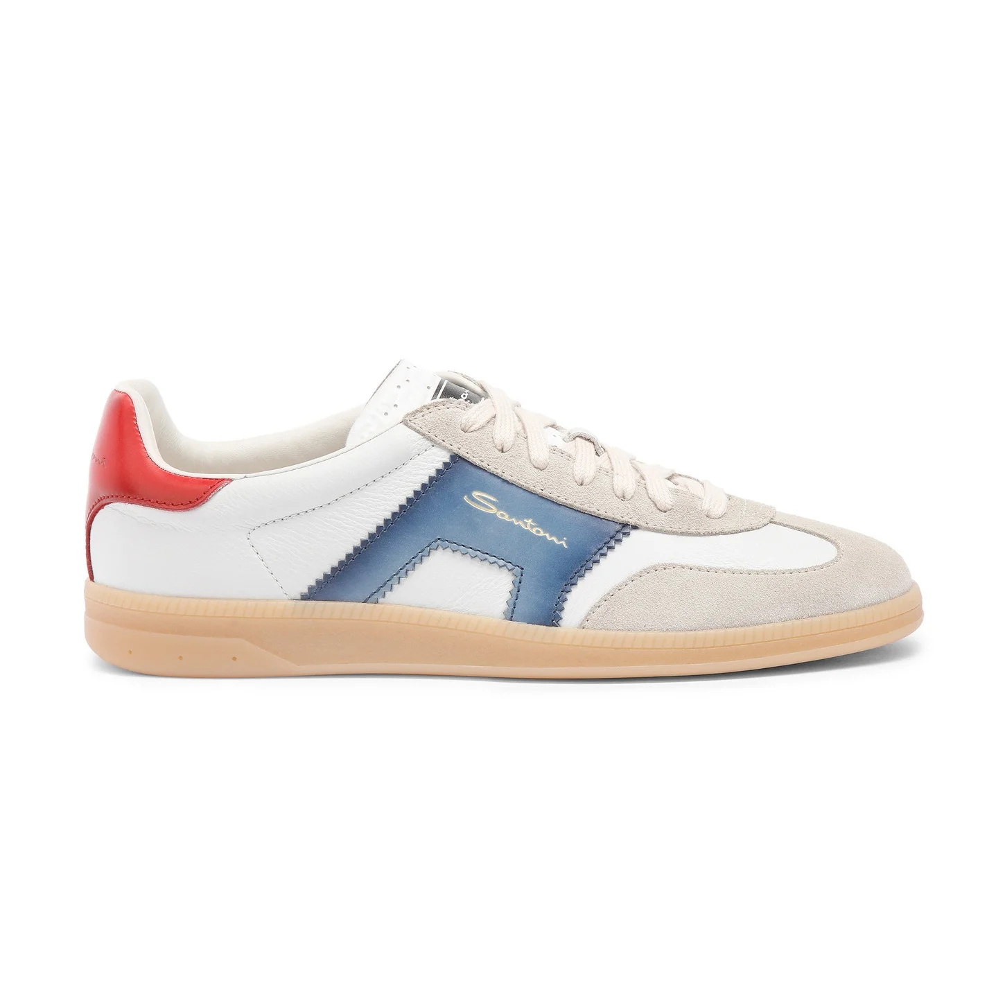 Inspired by an archival design, this DBS Oly Sneaker flaunts a retro look that nods to classic tennis shoes from the ‘70s. Distinguished by an elegant, lightweight silhouette, this men’s style is crafted from leather with suede overlays on the toe and eyestay. The gradated leather side detail with zig-zag edges is inspired by one of our signature codes—the double buckle—lifted from our formal shoe edit and transformed into a mark of modern style. Complete with a slim natural-toned rubber sole to accentuate its retro charm. Product details Product ID: MBPL21965FARCNOCI60 - Men's low-top sneaker - Crafted from leather and suede - Colour: white, blue and orange - Double-buckle-inspired leather side detail - Subtle double-buckle detailing on the tongue - Lace-up fastening - Natural-tone rubber sole - Santoni lettering moulded into the tread - Made in Italy