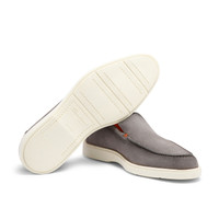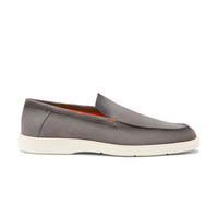 Distinguished by a delicate tapered silhouette, this loafer is dedicated to those with an understated style seeking effortless elegance even for informal occasions. Its premium suede upper and rubber sole offer a comfy, supportive feel, whilst orange details mark every stride with unmistakable Santoni attitude. Product details Product ID: MGDT17824TICBGEXG77 - Men's loafer - Crafted from suede - Gradient finish - Colour: grey - Apron stitching - Decorative orange stitches - Classic silhouette with wide fit and round toe - Smooth rubber sole - Printed Santoni logo on the insole - Made in Italy