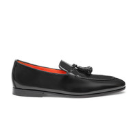 Striking the perfect balance between classic styling and contemporary attitude, this shoe rewrites the codes of the penny loafer with an exclusive twist. This style is crafted from shiny enamelled leather, flaunting a lightweight silhouette with tassel details and a woven apron trim. Thanks to its flexible Goodyear construction, the sole can be folded entirely in half, ensuring an exceptionally lightweight feel and superior freedom of movement for optimal comfort. This elegant loafer can also be resoled so that you can enjoy wearing it for many years to come. Product details Product ID: MCNC18458SA4BPOHN01 - Men's loafer - Crafted from enamelled leather - Colour: black - Tassels - Woven apron trim - Classic silhouette with tapered toe - Flexible Goodyear construction - Can be resoled - Leather sole with half rubber heel - Printed Santoni logo on the insole - Made in Italy