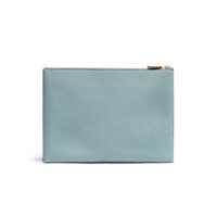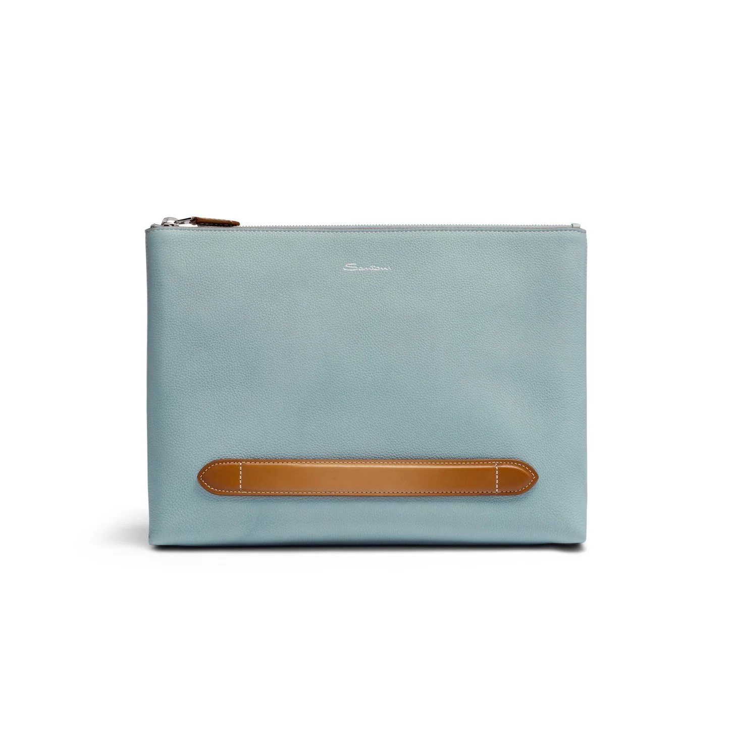 A refined accessory that exudes Santoni’s devotion to quality and perfection in every detail. This tumbled leather features a handle on the front, firmly securing it in the palm of your hand. Equipped with an inside pocket and a zip closure. Product details Product ID: UFPPA2588FOACSUZ51 - Crafted from tumbled leather - Color: sky blue - Zip closure - Inside pocket - Leather handle treated with Santoni’s “velatura” technique - Debossed Santoni logo - Dimensions: 32cm x 25cm x 3cm - Made in Le Marche, Italy