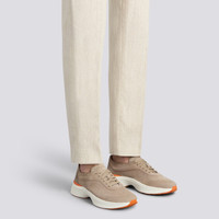 The Bounce sneaker marries a supportive running-inspired design with Santoni’s artisanal savoir-faire. Its soft, lightweight suede construction is enriched with a thermoforming treatment: a unique pressing technique that emphasises the shoe’s iconic detailing. Styled with a chunky rubber sole and micro-perforations on the sides for elevated comfort and versatility. Product details Product ID: MBBC22070BARTSOGE55 - Crafted from suede - Thermoformed treatment - Color: beige - Leather detail on the heel treated with Santoni’s velatura technique - Lace-up fastening - Unlined - Lightweight rubber running sole - Lug tread with Arancio Santoni orange detail - Made in Le Marche, Italy